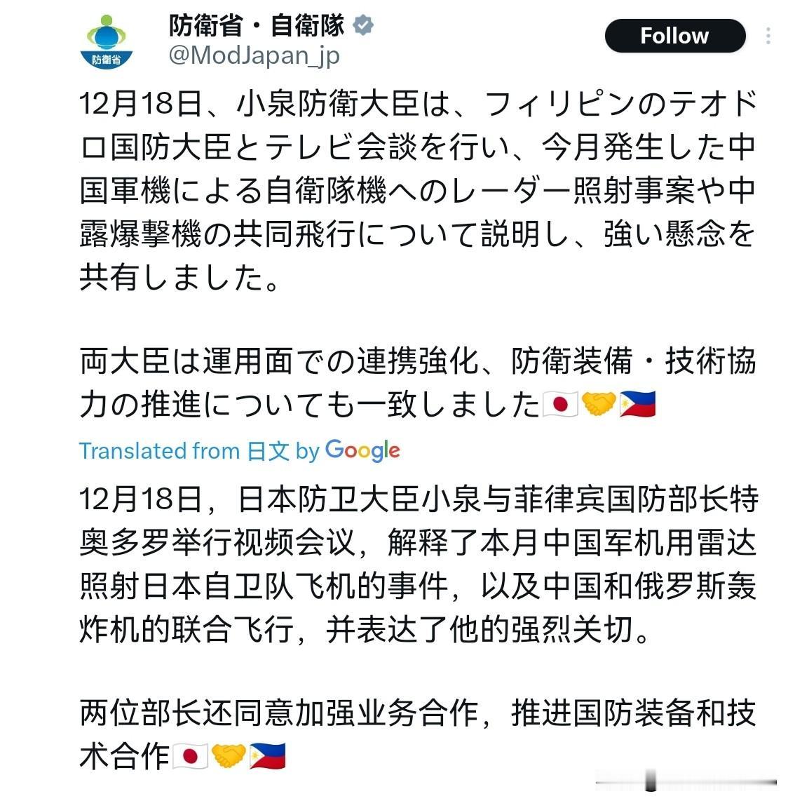 原本以为菲律宾会强烈支持日本,结果一贯对华强硬的菲律宾国防部长甚至中国的名都没有点!12月18日,日本防卫省发布新闻稿称,日本防卫大臣小泉进次郎与菲律宾国防部长特奥多罗举行视频会谈,围绕本月发生的中国军机对日本自卫队飞机实施雷达照射事件,以及中俄轰炸机联合巡航一事进行了说明,双方就此表达了强烈担忧。两国防长还就强化实操层面的协作、推进防卫装备与技术合作达成共识 。 很显然,我们与菲律宾之间刚发生,我海警驱离闯入仙宾礁海域的菲律宾渔船事件,按道理说菲律宾与日本应该非常有“共同语言”。但是,让人没有想到的是,菲律宾只愿意对于相关事件表示强烈担忧,而不敢点名我们,这确实非常值得玩味。无疑,对于中日纠纷,菲律宾持有的是迷糊立场。 如果追问一句,菲律宾到底强烈担忧什么呢?是担忧我们反制日本的动作,还是担忧中日紧张局势升温,菲律宾则没有言明。菲律宾的立场,这说明什么呢?这无疑说明菲律宾既想递投名状、又在给自己留后路。明着跟日本“共享担忧”“强化协作”,暗指的对象就是我们。 但菲律宾不愿意点名,就意味着菲律宾不愿真撕破脸,避免双边关系彻底恶化。某种程度来说,这也方便后续管控分歧、重启谈判,留下转圜余地。很显然,日本与菲律宾通话,是希望抱团取暖,但是日菲双方明显是各怀鬼胎。由此可见,菲律宾虽然跟我们关系不好,但是也并不打算跟我们走向彻底对立。