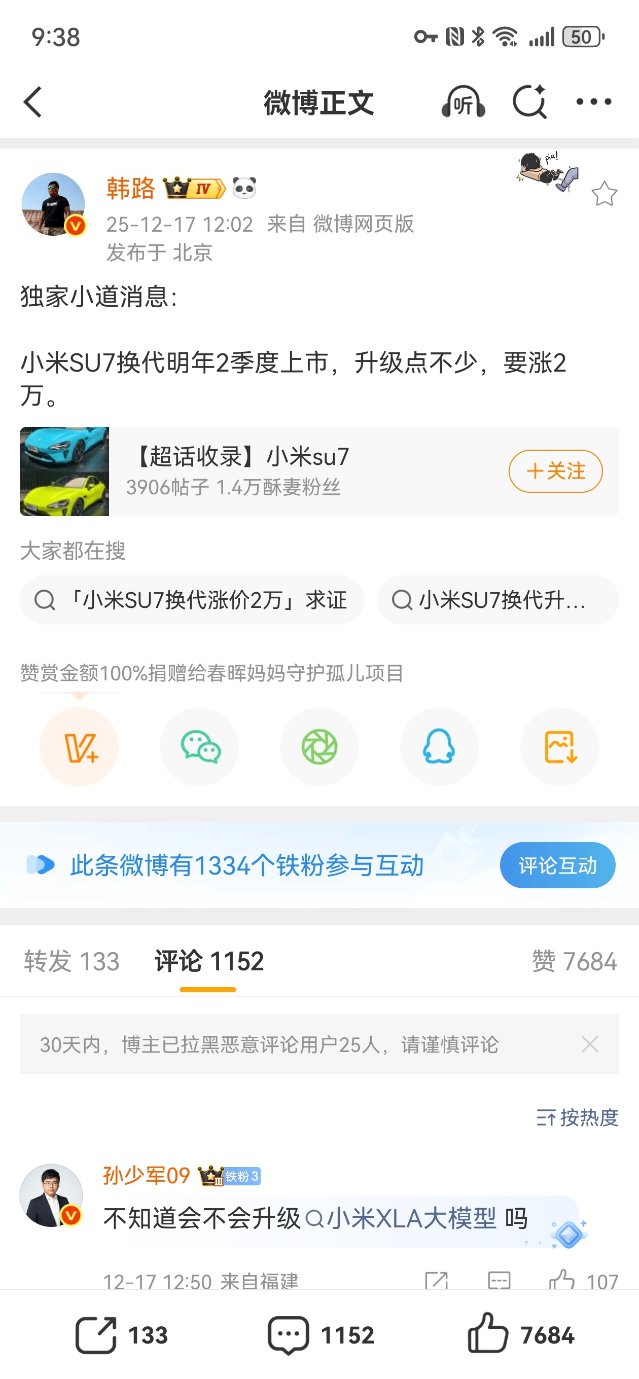 小米SU7换代或涨价2万元 大老师说了,这事儿就是准的了,你们觉得涨价会不会影响小米SU7的销量?