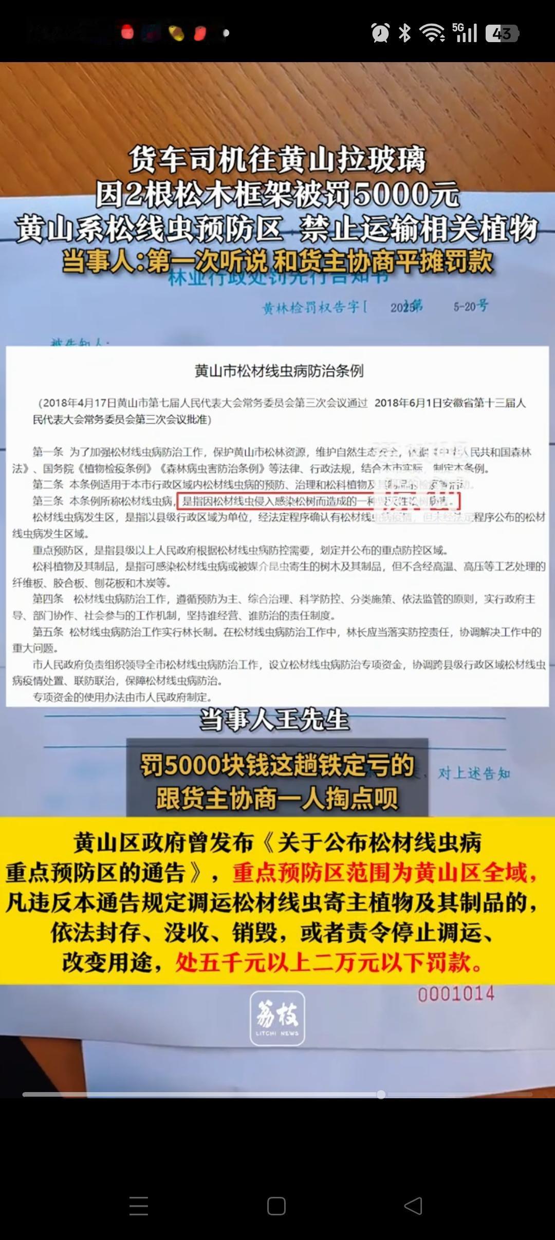 这下好了, 货车司机都要注意了! 安徽黄山,一货车司机往黄山拉玻璃,因为绑了2根松木框架,被罚款5000元。听到理由后,他懵了!原来当地是风景区,为了保护其它树木,松树一直是禁止往这边运的,且早就有明文规定。 其实一些专门跑运输的人还是知道的,当地的厂家也清楚。但是这是货车司机第一次往这边送,不清楚,厂家也没有交代清楚,才造成的误会。 也能理解当地的这个规定,但是希望沿路多一些提醒的标识,告诉大家。让一些偶尔来的人,能够提前知道,免费被罚款。 毕竟5000块钱对于一个货车司机,还是有点多了,他也不是故意的。大家怎么看呢?
