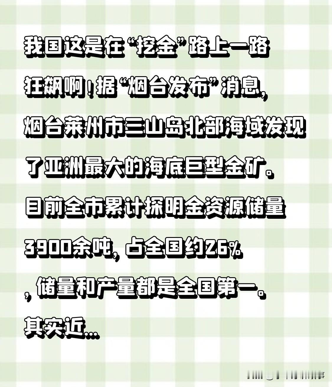 震惊!我国在“挖金”之途一路疾驰!据“烟台发布”,烟台莱州市三山岛北部海域发现亚洲最大海底巨型金矿。目前全市累计探明金资源储量超3900吨,约占全国26%,储量与产量皆居全国首位。 近年我国金矿发现不断。2024年11月,辽宁探明首个千吨级超大型金矿床;同年10月,甘肃玉门发现大型金矿。截至2024年底,全国金矿查明资源量达1.2万吨,彰显资源丰富,为经济注入动力。