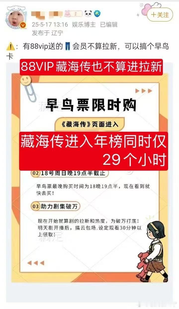 肖战《藏海传》28分钟登顶拉新周榜,29小时闯入年榜,后续还拿下优酷拉新年榜史冠,这是肖战全球号召力的硬实力体现,不是谁能碰瓷的。 还有88VIP不算藏海传拉新是平台规则,拿这个泼脏水,只会显得老呃粉没常识又没风度,发现老呃家每次打不过就喜欢造y