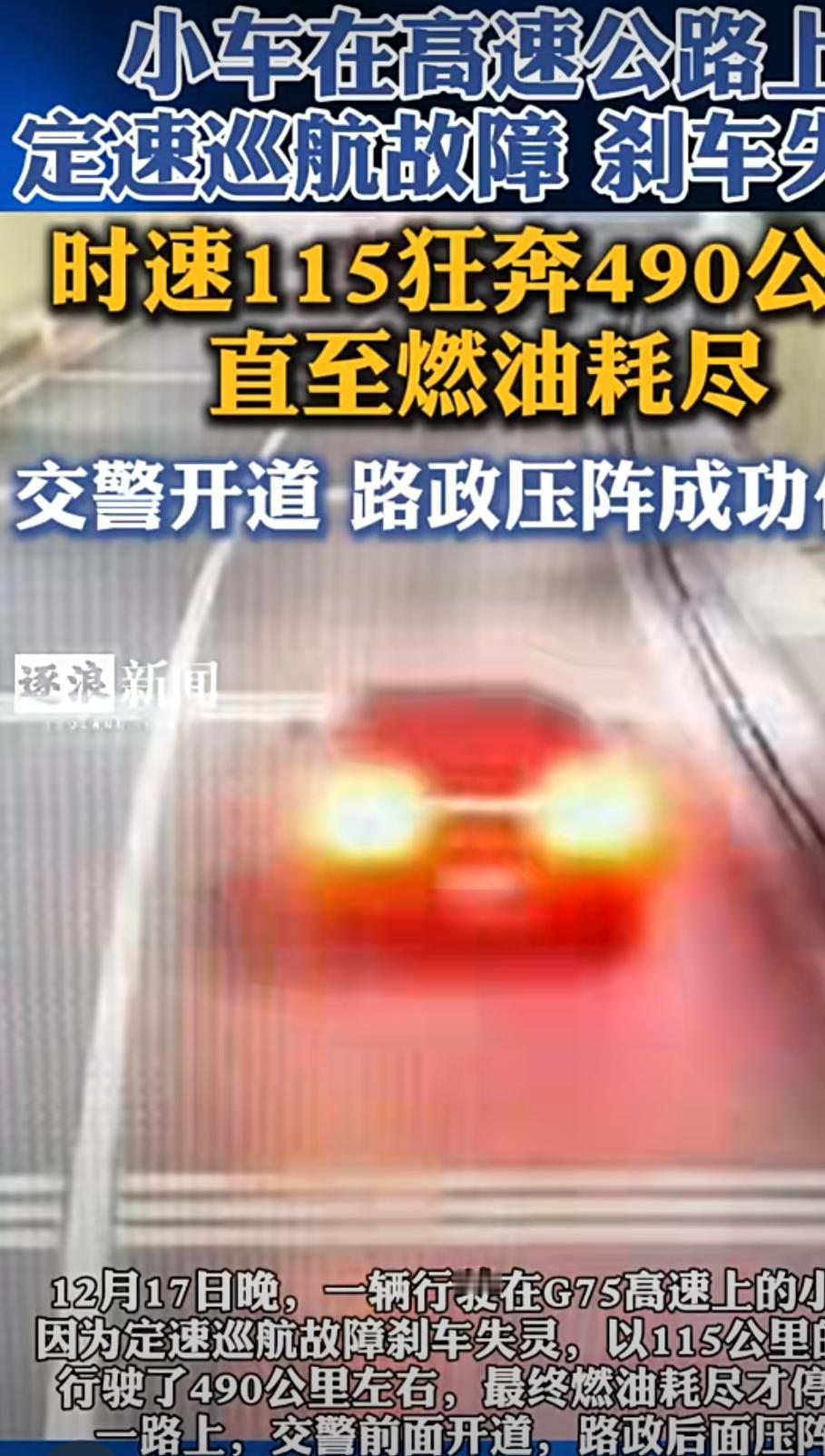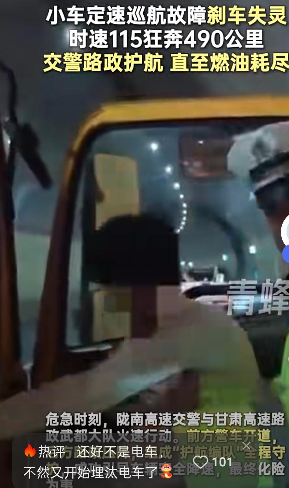 惊险490公里!兰海高速小车失控狂飙4小时,交警路政"生死护航"终脱险 12月17日晚,G75兰海高速上演了一场惊心动魄的"生死时速"——20多岁的马某驾驶甘A牌小车从兰州返程,定速巡航设定115公里/时后突然失灵,刹车也跟着不管用了,车子像脱缰的野马一路狂奔。 吓坏了的马某第一时间报警,一场跨区域的紧急救援立刻启动。定西交警先接过"接力棒",警车开道伴行,用扩音设备喊停沿途车辆避让,还全程打电话安抚他的情绪。当晚7点25分,陇南高速交警在岭峰隧道接棒,联合路政、救援等部门组成硬核"护航编队":前面警车开道警示,两侧车辆防护,后面路政车压阵控速,沿途收费站全封闭,硬生生清出一条安全通道。 就这样,失控小车以115公里的时速在高速上狂奔近500公里,交警路政一路紧随。直到当晚10点02分,车子在强家湾隧道终于因燃油耗尽停稳,马某和同行乘客下车时已经瑟瑟发抖,万幸毫发无伤。路政人员赶紧上前安抚,随后将两人送往陇南,故障车也被安全拖离。 网友看完都忍不住点赞:"这哪里是护航,简直是用责任筑起生命墙!" 目前车辆故障原因还在和车企核查,但这场多部门联动的"教科书式救援",真的太让人安心了!