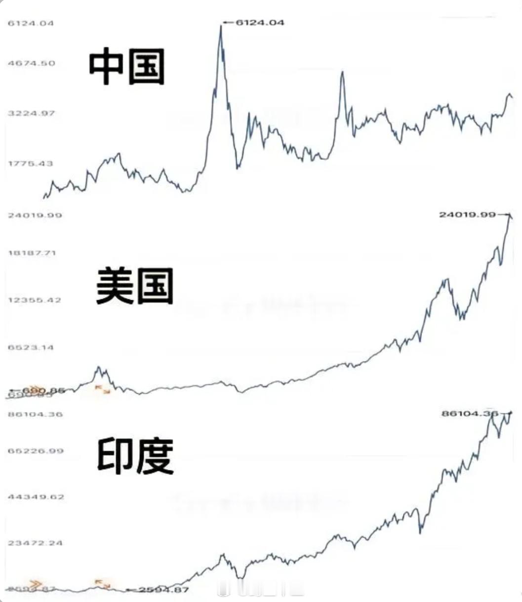 a股 人生4大错觉 1:美股要崩,2:大A要涨,3:他喜欢你 4:她不一样配图:中国,美国,印度股市过去20年走势图