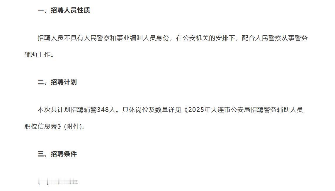 辽宁多地辅警招录启动!本溪、大连岗位来袭,报考攻略看这里 📢 辽宁考生注意!近期本溪、大连两地公安局相继启动2025年警务辅助人员公开招聘工作,优质岗位等你来报,想投身警务辅助工作的小伙伴速来划重点! 📍 大连招录亮点 ✅ 招聘规模大:计划招录348人,岗位详情可查看官方职位信息表 ✅ 报名时间:2025年12月19日9:00至12月27日15:00,网上报名 ✅ 学历要求:本科及以上,退役军人、消防救援退出人员及部分留置看护岗位放宽至大专 ✅ 加分政策:退役军人等加10分,公安/法学类毕业生、在职民警配偶加5分(不累计) ✅ 笔试内容:行政职业能力测验+公安基础知识(客观题),合格线60分 📍 本溪笔试关键信息 ✅ 笔试时间:2025年12月27日(周六) ✅ 准考证打印:12月23日9:30至27日9:30,登录指定平台彩色打印 ✅ 成绩查询:后续可通过官方平台查询合格分数线 💡 重要提醒 两地均需密切关注官方平台发布的后续通知 资格审查贯穿招录全程,务必如实填报信息 机会难得,符合条件的小伙伴赶紧准备起来!转发给身边有需要的人~ 辽宁辅警招录 大连招聘