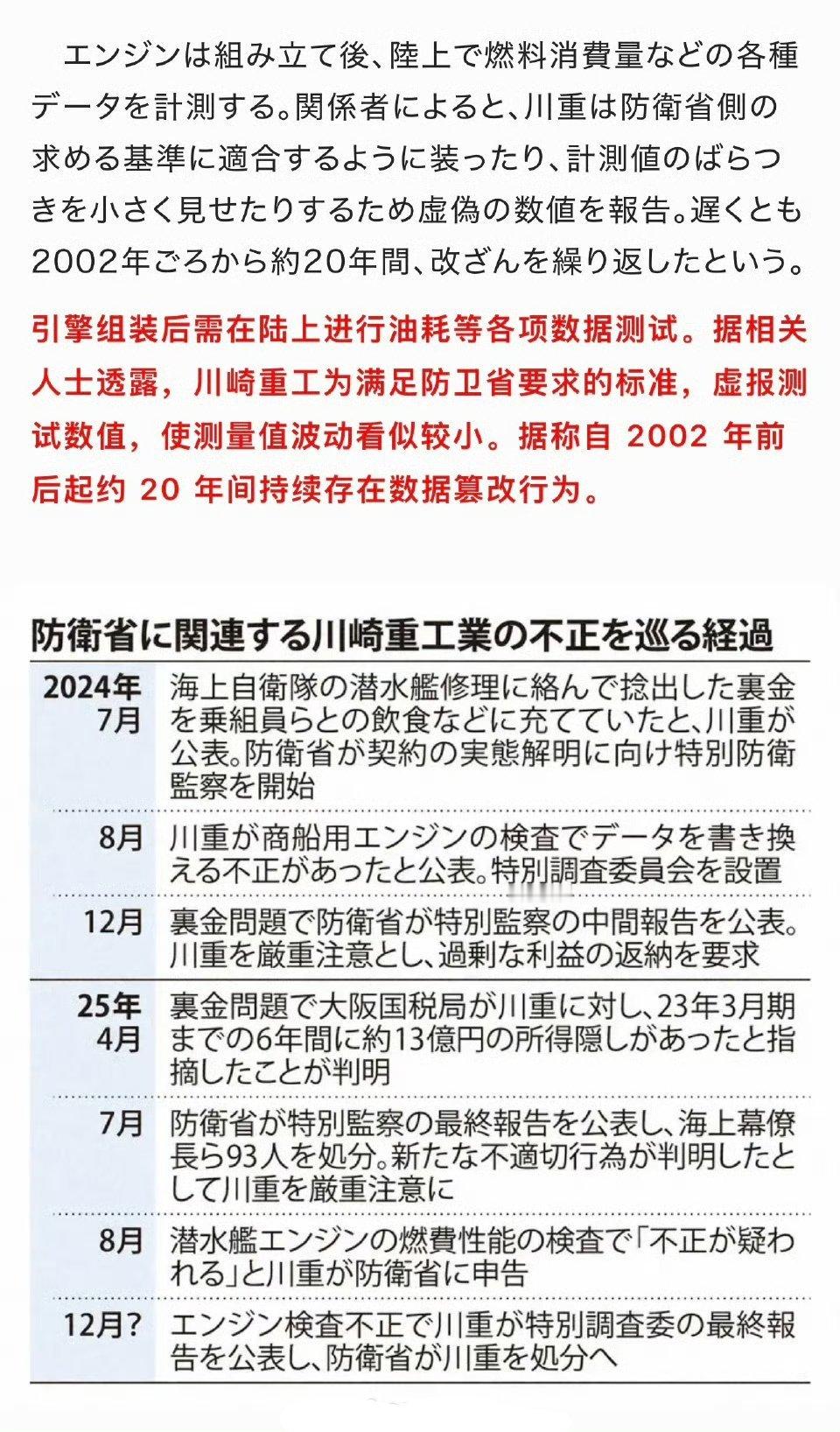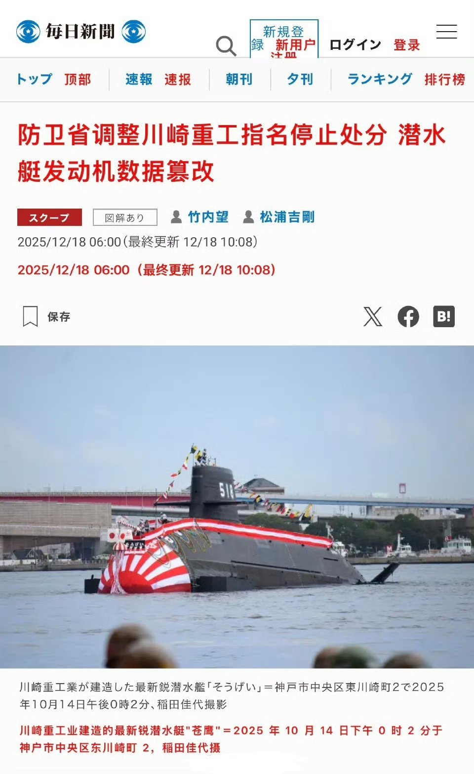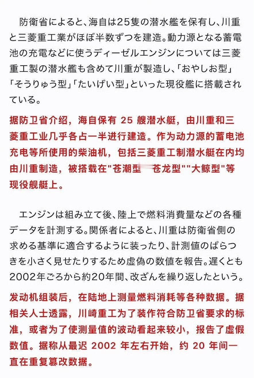 日本潜艇制造商川崎重工造假被罚!川崎重工从2002 年以前就开始伪造给海自制造的潜水艇柴油发电机数据,造假造了 20 多年!海上自卫队现役 25 艘潜艇的柴油发电机均为川崎重工制造,该发电机被搭载于“亲潮”级、“苍龙”级、“大鲸”级等现役潜艇之上。目前虽然防卫省坚称本次造假对潜艇性能没影响,但还是能从其暂停 2.5 个月中标资格,要求赔付违约金等方面看到他们的愤怒,而内部也在质疑这样的惩罚是不是太轻了。海外新鲜事热点观点 烽火问鼎计划