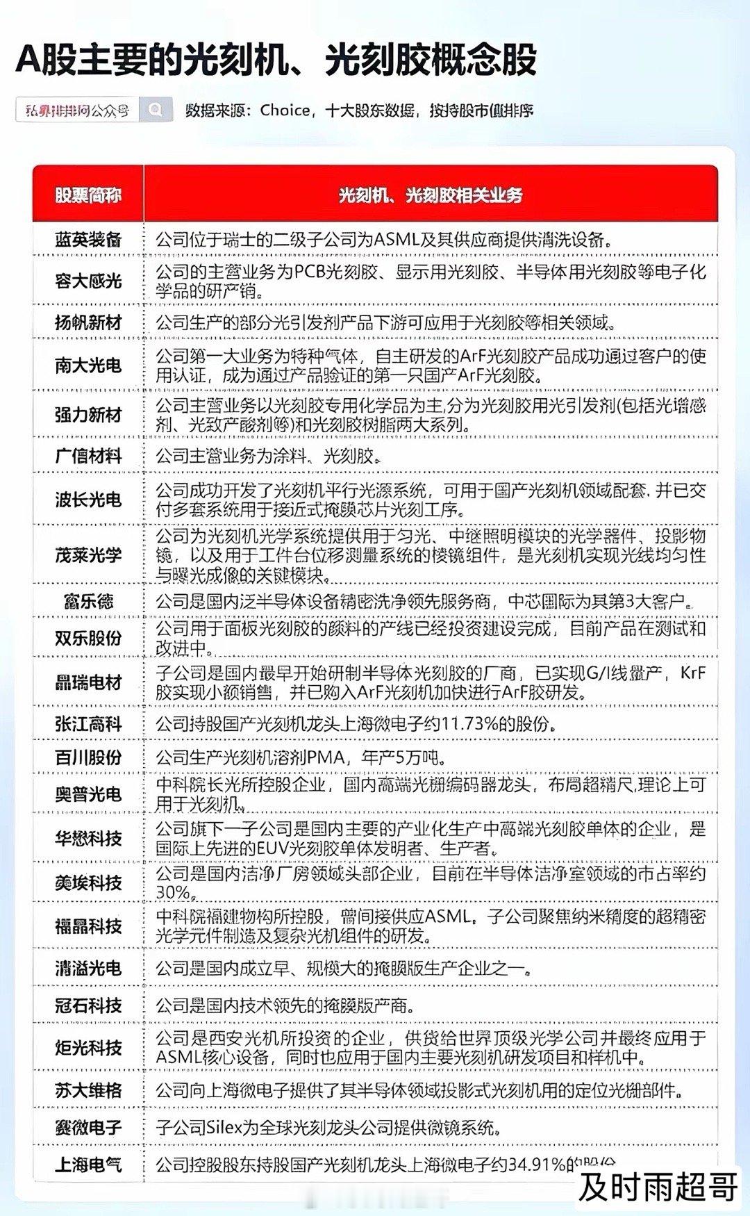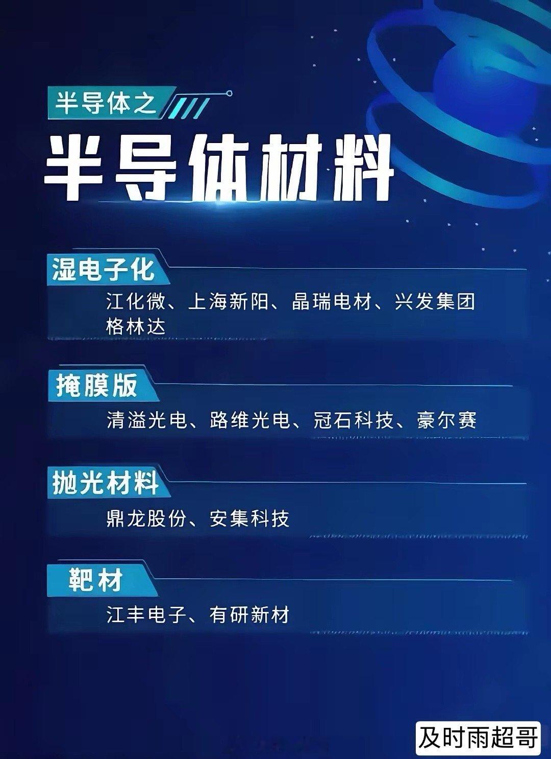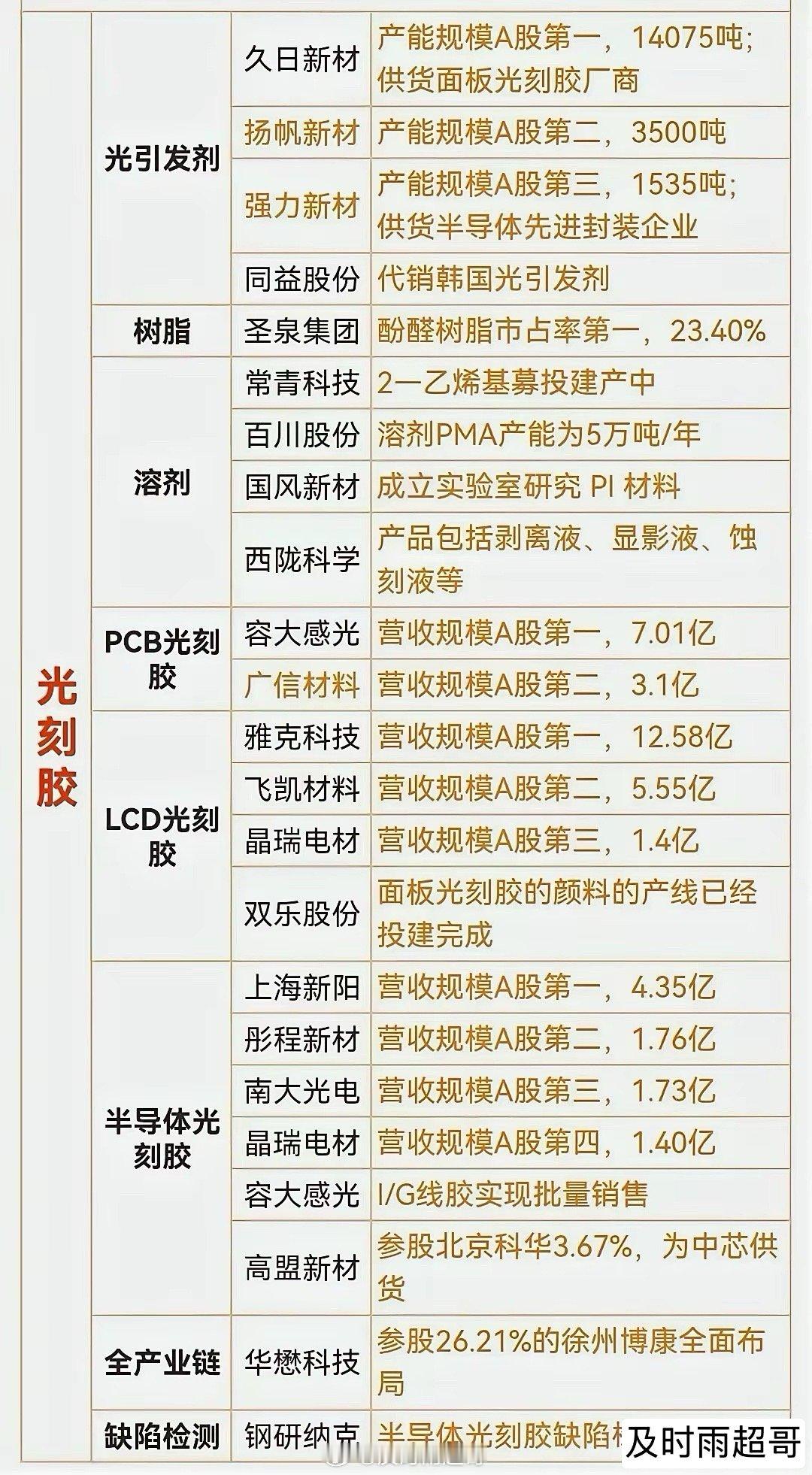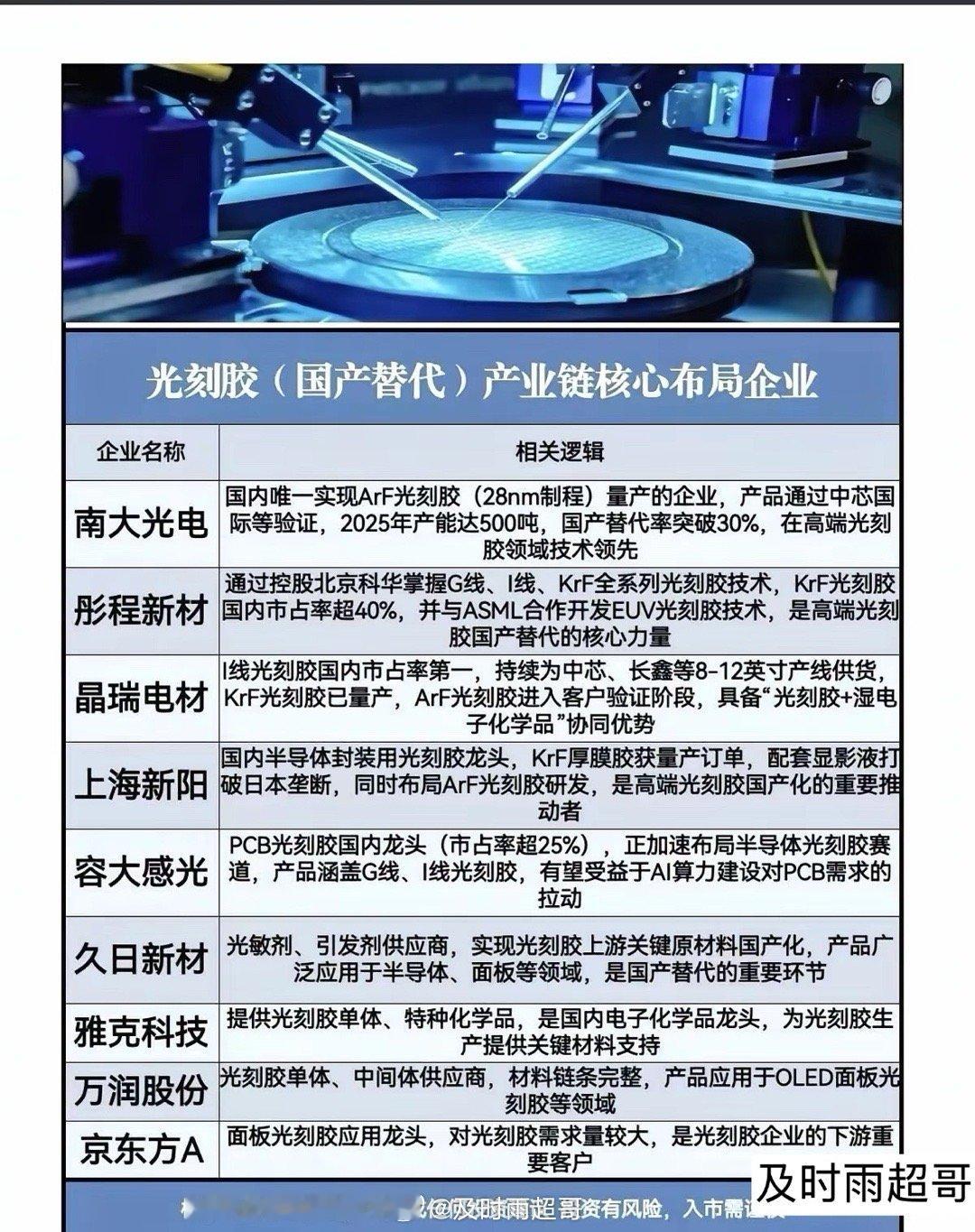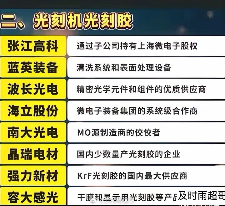 没有光刻胶的光刻机就是一堆废铁。而全球90%的光刻胶被小日子垄断,断供也是迟早的事情。国产替代迫在眉睫。与光刻胶有关的A股上市公司有:久日新材、扬帆新材、强力新材、同益股份、圣泉集团、长青科技、百川股份、国风新材、西陇科学、容大感光、广信材料、雅克科技、辉凯材料、双乐股份、上海新阳、彤程新材、南大光电、晶瑞电材、有研新材、高盟新材。