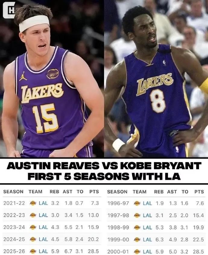 NBA生涯前5年,科比与里夫斯对比:第1年:科比:7.6分,1.9篮板,1.3助