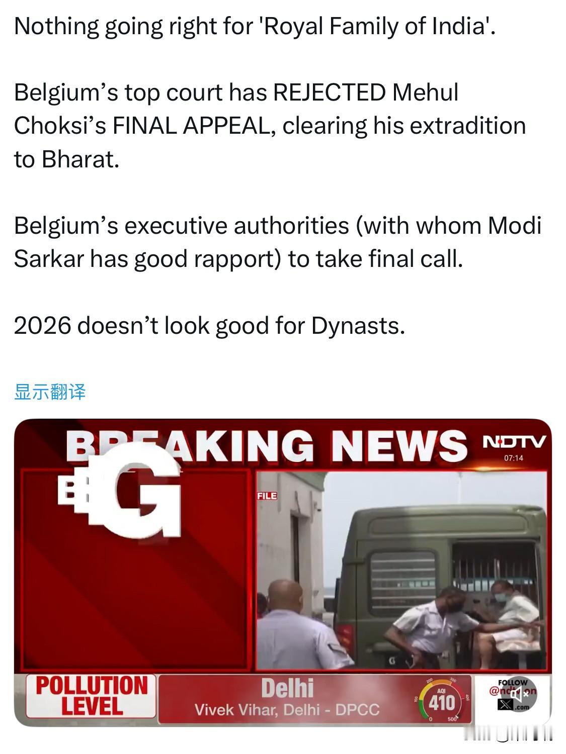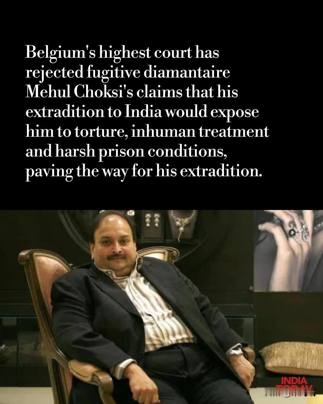 比利时最高法院驳回了印度金融逃犯 Mehul Choksi 的最终上诉,为他被引渡回印度铺平了道路。 Choksi 是旁遮普国家银行 (PNB) 1300亿卢比(约20亿美元)欺诈案的主要被告之一,他与侄子 Nirav Modi 一起被控。 在印度发出引渡请求后,Choksi 于 2025 年 4 月在安特卫普被捕。他随后对引渡提出上诉,声称在印度面临不人道待遇或不公平审判的风险。 比利时法院驳回了他的所有论点,包括关于政治动机或被绑架的说法。最高法院(最高上诉法院)的裁决最终确认了较低法院的决定,即印度的指控符合比利时法律,且印度政府提供了充分的待遇保证。 随着司法程序的结束,比利时行政当局(可能指司法部长)将做出最终决定,执行引渡令。