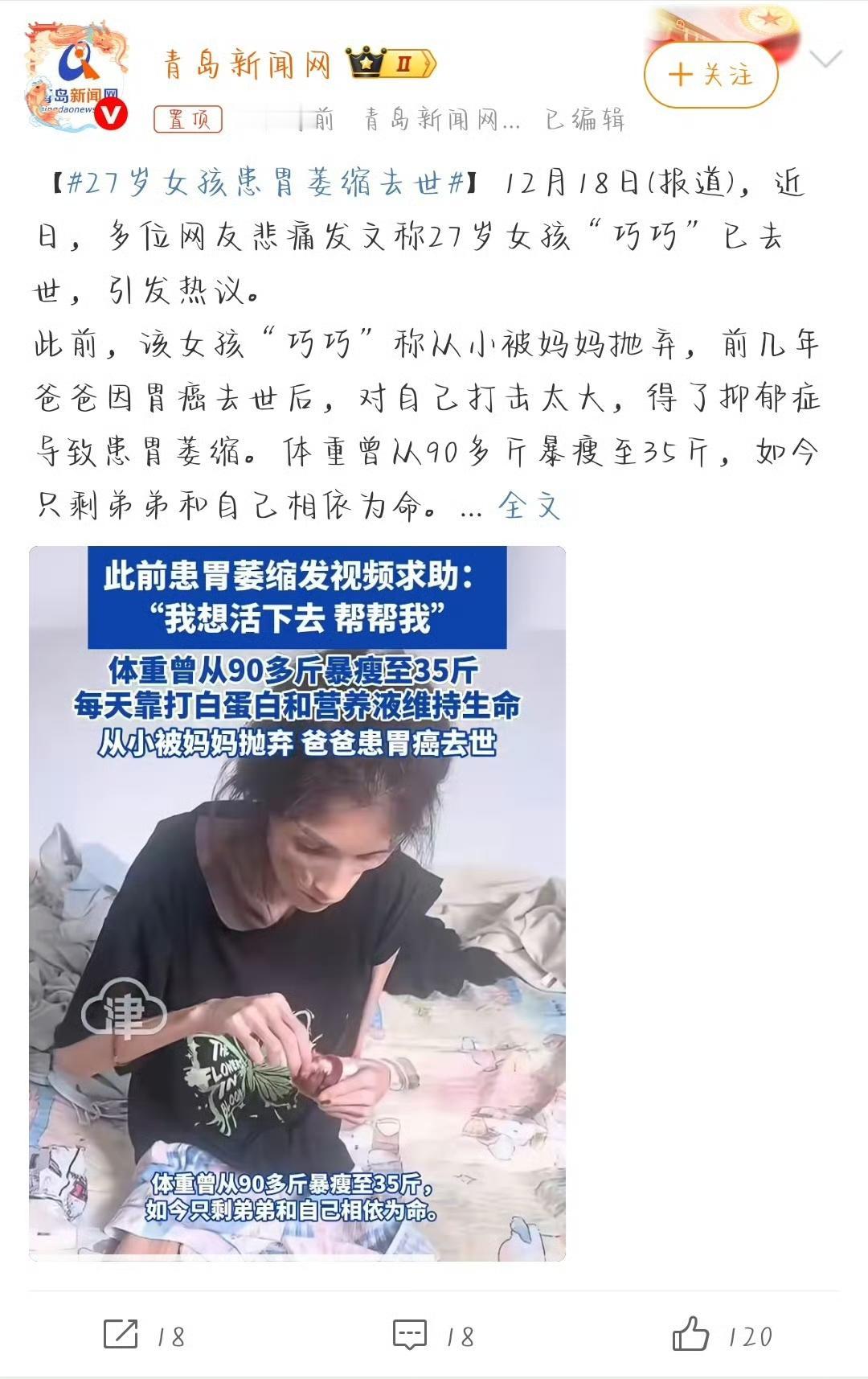 💔27岁女孩脑萎缩去世:从90斤暴瘦35斤,临终遗言让全网泪崩 1. 生命倒计时:35斤皮包骨的最后抗争 12月17日凌晨,广东女孩巧巧因多器官衰竭离世,年仅27岁。5个月前,她曾举着身份证求助:“我想活下去,求大家帮帮我。”镜头里,1米6的身高蜷缩成婴儿般大小,皮肤紧贴骨骼,连呼吸都显得费力。医生诊断显示,长期极端节食导致她患上重度胃萎缩,胃黏膜几乎丧失消化功能,最终引发脑萎缩等并发症。 2. 病因罗生门:减肥、抑郁还是家族病? - “减肥执念”成导火索: 曾是清秀姑娘的她,为追求“漫画腿”“A4腰”长期节食,体重从90斤暴跌至35斤,最终确诊神经性厌食症,消化系统彻底崩溃。 - 抑郁与遗传叠加: 父亲因胃癌去世后,她陷入重度抑郁,失眠、拒食长达两年,被公司辞退后病情恶化。有医生指出,情绪压力会直接损伤肠胃功能,而胃癌家族史可能加剧了器官衰竭风险。 3. 亲情缺位:母亲改嫁,弟弟被指冷漠 - 原生家庭之痛: 6岁遭母亲抛弃,父亲去世后与弟弟相依为命。临终前,她攥着志愿者的手哭求:“我想见妈妈。”这个愿望最终成了遗憾。 - 捐款争议漩涡: 网友质疑弟弟私吞善款买豪车,虽无实锤,但弟弟在她病逝时未守床前,反而在酒吧拍视频,引发舆论声讨。 4. 全网反思:病态审美杀死了谁? - 专家痛批“白幼瘦”文化: 北京协和医院营养科主任李薇表示:“极端节食会导致脑萎缩、心脏衰竭,健康体重范围才是生命力的体现。” - 年轻人觉醒呼声: “她只是想要妈妈的爱和健康,怎么这么难?”“我们总以为年轻可以挥霍,直到悲剧发生才惊醒。” 5. 生命警示:别让“瘦”成为死亡密码 - 数据触目惊心: 世界卫生组织统计,神经性厌食症致死率高达20%,中国患者超2000万,且年轻化趋势明显。 - 重建健康认知: 心理医生建议:“体重不是价值标尺,身体发出的信号才是生命的倒计时。” 27岁女孩脑萎缩去世 病态审美之殇 生命不能承受之轻 互动话题: - 你认为“白幼瘦”审美该被批判吗? - 如果遇到类似困境,你会如何自救?评论区聊聊! (配图建议:生前对比照/病床求助视频截图/网友悼念花海) 记者手记: 当“瘦”被异化为生存法则,无数年轻人在节食与焦虑中挣扎。巧巧的悲剧,是时代病的极端投射。她用生命告诉我们:真正的美,是健康的体魄和被爱滋养的灵魂。愿天堂没有饥饿与冷眼,愿生者能读懂她用生命写下的警示。