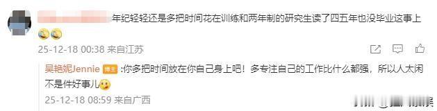 吴艳妮,引发热议,本人回复了! 12月17日,田径名将吴艳妮发布一则九宫格写真,引起网友热议! 评论区有位网友说: 多把时间放在训练和二年制研究生读了四五年还没毕业这件事。 12月18日,吴艳妮回怼了这条评论,吴艳妮称: 你多把时间放在你自己身上吧,多关注自己的工作比什么都强,所以人太闲不是件好事。