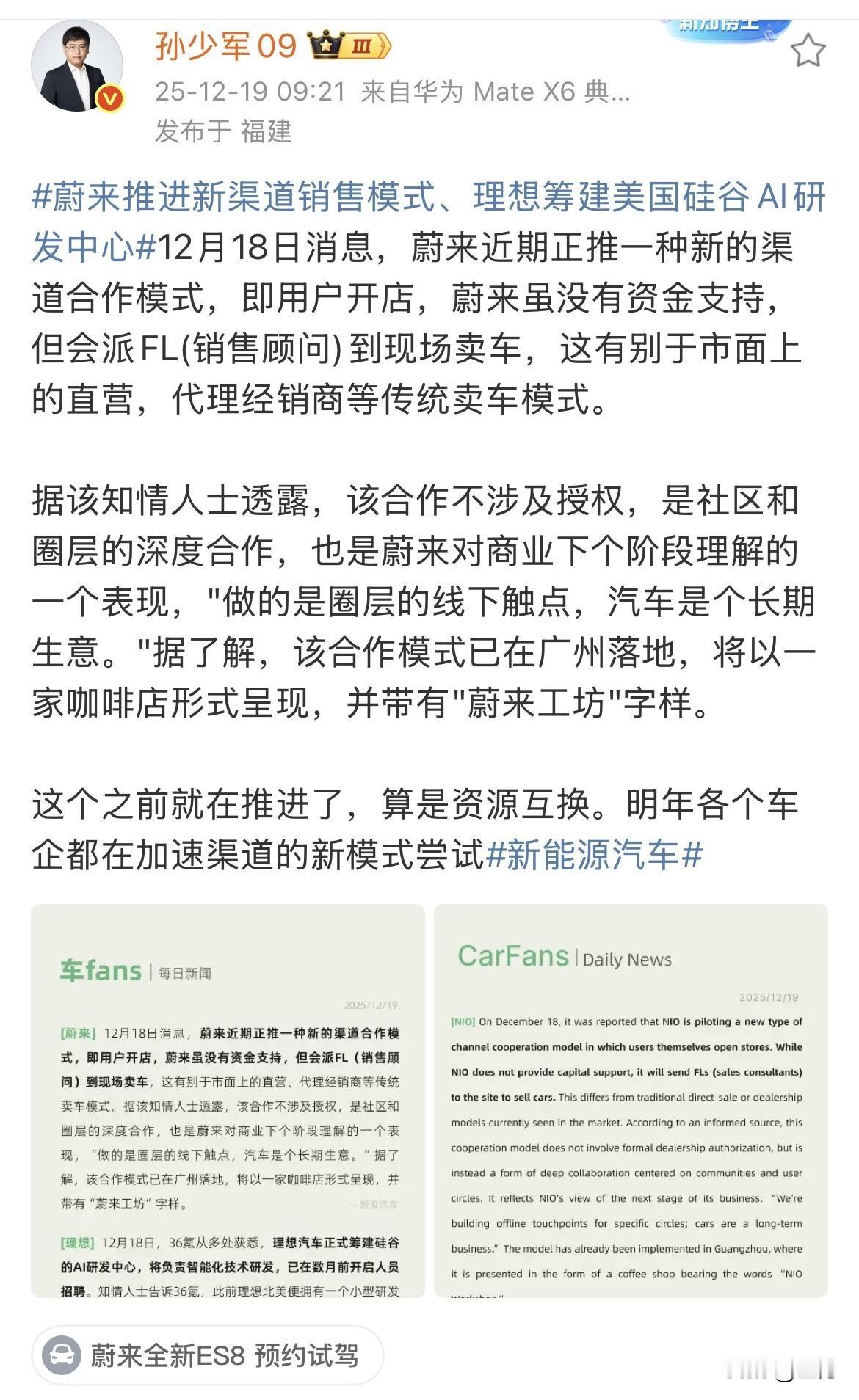 孙少军: 蔚来在尝试让用户直接卖车[捂脸] 就是刚才,孙少军发出蔚来正在探索的一种新型的销售模式,与以前卖车的形式完全不一样了,不需要4S店也不需要,甚至不需要销售人员[捂脸] 而是需要客户深度参与,有人说这是不是客户给客户介绍,然后蔚来来来个顾问给你介绍,这单生意就算OK了 孙少军认为其实还是没有那么简单的,因为这种新的模式广义上讲,其实就是渠道合作,渠道方只要出场地,人还是厂家出。这个模式好几个品牌在试水了,去年应该就在磨合了。 只是不知道最重这个钱要如何分,比如卖了一单子赚了100,000块钱,用户这边分多少,蔚来品牌要分多少?那个介绍的销售人员,他实际上占的贡献比重到底有多大,该怎么分。 这种销售模式好像与以前的完全都不一样了,不知道今后能不能能够行得通,不过如果能够把客户发展成销售,并且给予他们一定的销售分成激励,确实是个不错的主意。