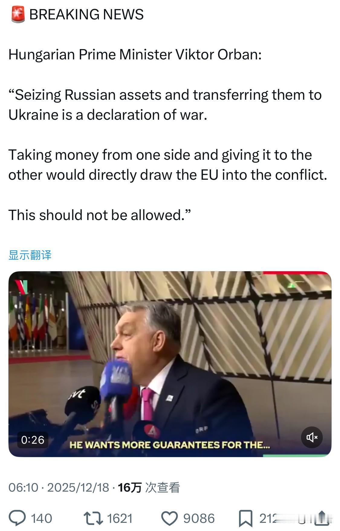 突发新闻:匈牙利总理维克托·欧尔班说, “扣押俄罗斯资产并将其转移到乌克兰,这无异于宣战。” 从冲突一方收钱给另一方,会直接将欧盟卷入冲突之中。这种行为绝对不能被允许。