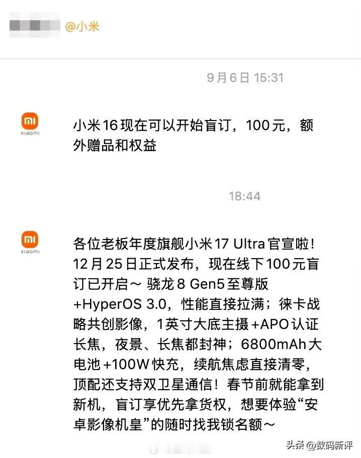 小米17Ultra配置爆料[奸笑]6800毫安电池+百瓦快充,顶配双卫星通信,超大杯旗舰电池容量到7K毫安的应该只有findX9Ultra和荣耀magic8RSR两款,超大杯还是注重影像,其他配置也不能弱,只有委屈一下电池容量了[奸笑]徕卡APO长焦,前有蔡司APO长焦,下周四发布