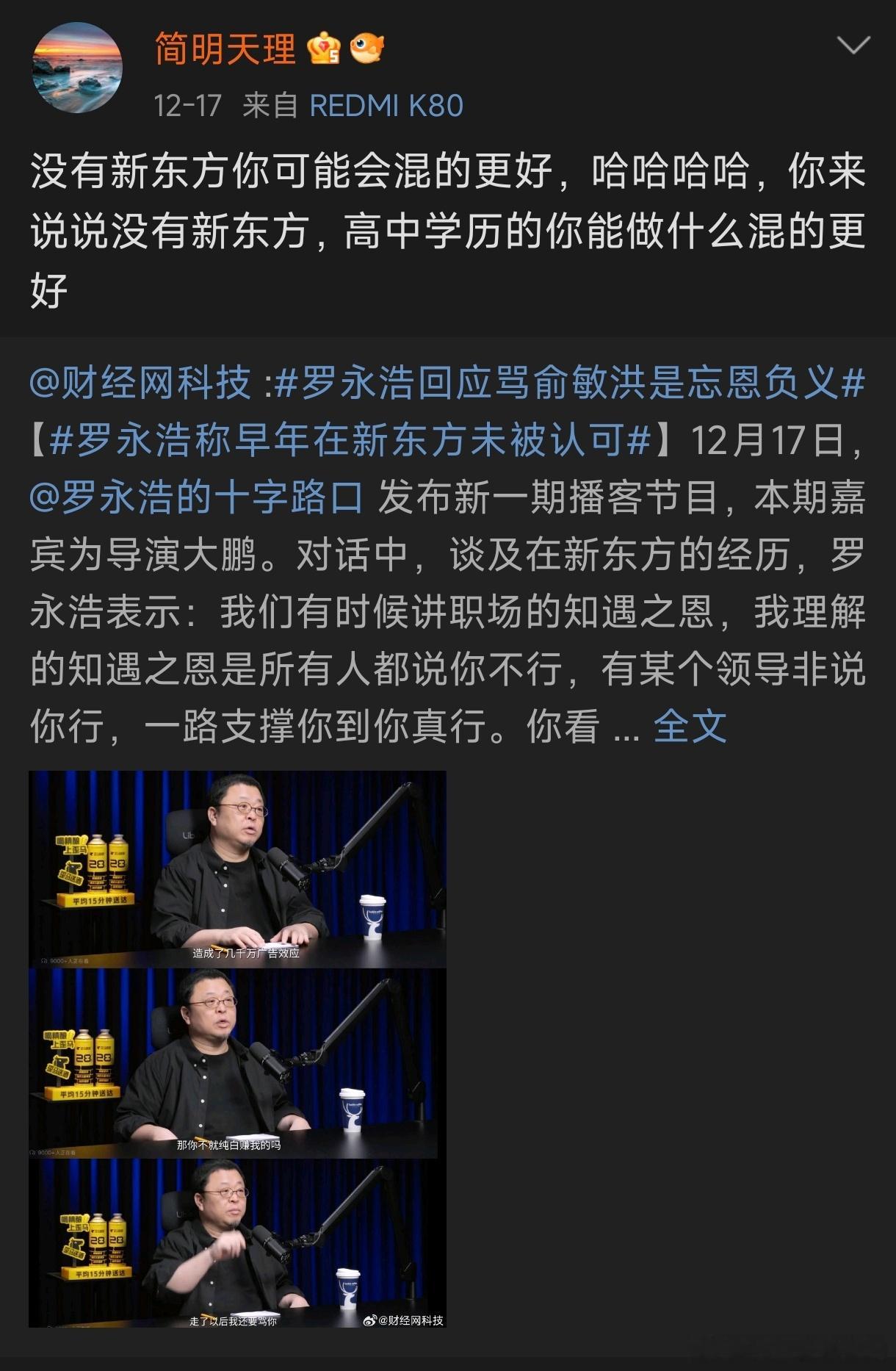 罗永浩隐藏嘲讽网友用红米K80博文好奇!用红米K80丢人吗?不偷不抢,自己辛苦赚