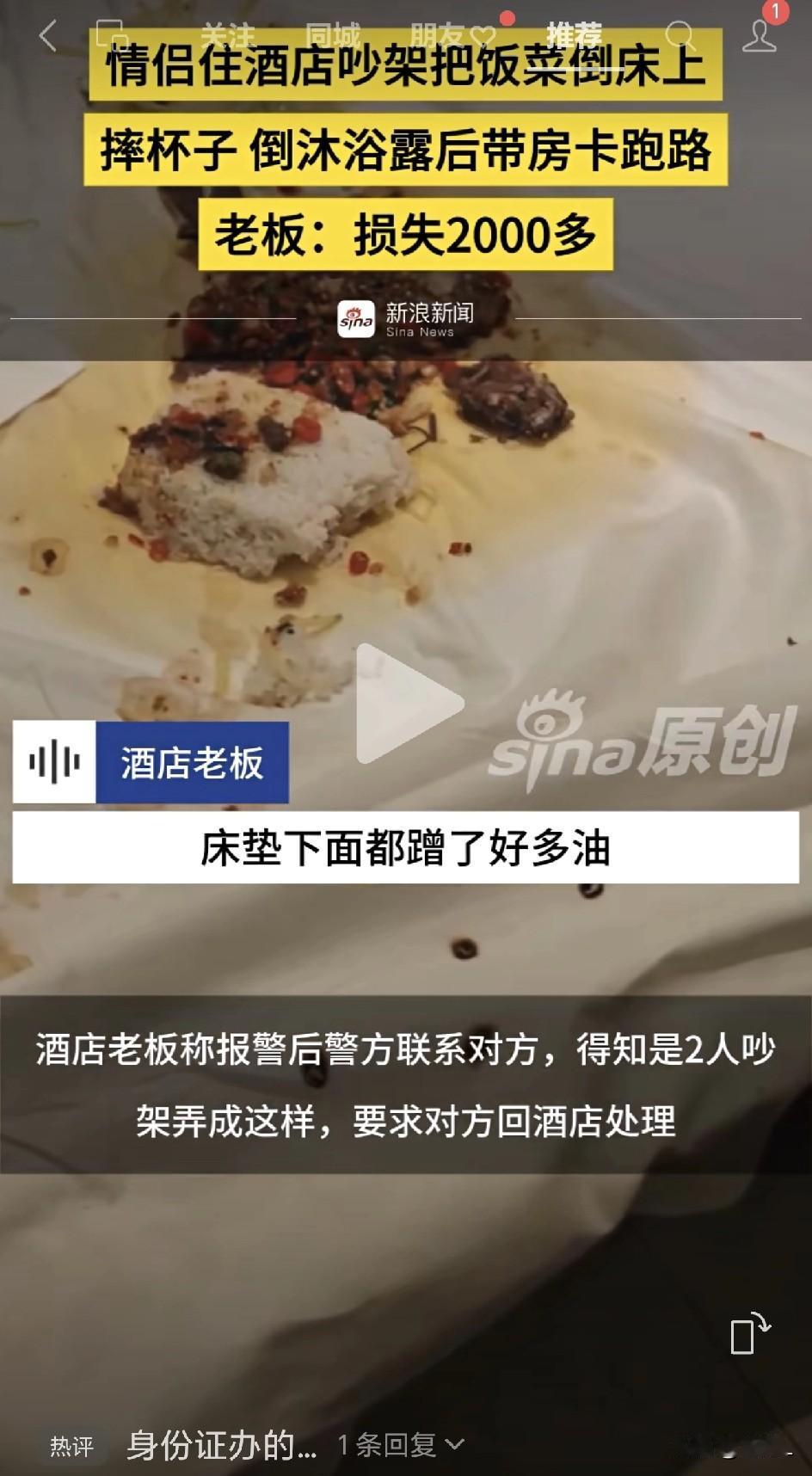 情侣吵架,在酒店上演“全武行”:摔杯倒饭泼沐浴露,老板看着2000元账单手都抖:这还是成本价! 本来是小情侣闹别扭,结果把酒店房间整成了“灾难现场”! 12月17日,长沙某酒店老板遇到了糟心的一幕。 一打开房门,差点当场心梗——雪白的床单被红烧肉汤汁泡成了“地图”,玻璃杯碎片崩得满地都是,浴室地上黏糊糊的沐浴露能溜冰,最绝的是:俩人居然揣着房卡跑路了! “光是那床垫就废了,油渗进去根本洗不掉!”老板掐指一算,床品、清洁、维修……零零总总的直接损失2000多块,这还是成本价。 报警后剧情更抓马:原来这一切只是因为小情侣闹别扭,男方在电话里一脸懵,说可能是吵架后女友所为,自己不知情! 酒店老板说,“从没见过这么恶心的人!” 网友神评: “这是把酒店当分手擂台了?” “建议列入民宿黑名单天花板!” “房卡带走是几个意思?准备忆苦思甜再来回味战况?” “身份证办的入住,跑哪去?” “这根本不是吵架问题。纯粹就是心眼坏。 家里的话 敢这样破坏么?” “都是实名,直接报警抓人。” “毛病都是惯出来的!” “感情可以一拍两散,该负的责任不能一跑了之!” 目前警察叔叔已介入调解。 哎呀,这都是什么家庭教育出来的孩子啊?一个不如意就把饭菜倒在床上、被子上,把沐浴露挤到整个洗手间到处都是。 这不是情绪巨婴又是什么呢?事情只要不如意就撒泼打滚搞破坏,还真当自己是小婴儿有人会全权兜底? 要是想一直当婴儿,就别出来祸祸社会,就躺在家里让你爹你妈好好供着你,除了你的生身父母,社会上断断不会有人惯着你! 也提醒各位荷尔蒙爆棚的情侣们:恋爱有风险,发火需谨慎,酒店物品可不是你家道具啊!惹了祸,就该赔偿赔偿,该负责负责! 信息来源于新浪新闻,侵联删!