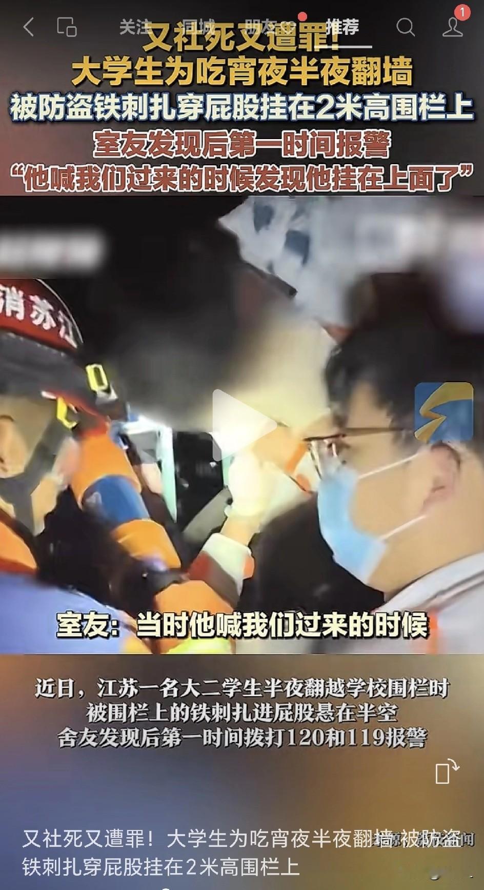 馋虫上脑!大二男生半夜翻墙撸串,结果被铁刺“封印”在半空……网友:这夜宵就非吃不可吗? “为了这顿夜宵,屁股差点成了‘糖葫芦’……” 近日,江苏淮安某高校,一名大二男生半夜馋虫作祟,决定翻越学校围栏出去吃宵夜。 没想到刚翻到一半,围栏顶上的铁刺直接扎进臀部,把他“钉”在了半空中! 男生忍痛给舍友打电话求救,舍友吓得秒打119和120:“我兄弟被栏杆串成串儿了!” 消防员赶到现场一看——好家伙,这位同学正“挂”在围栏上晃悠。 医务人员先确认他生命体征平稳(“人还活着,就是屁股有点疼”),消防员随即抄起液压破拆工具,像剪牛排一样“咔嚓”剪断铁刺。 10分钟后,男生终于“脱钩”,被送往医院做“拔刺手术”。 网友辣评: “干饭人用生命在熬夜宵!” “学校围栏:没想到吧?我带反馋猫系统的。” “建议校规加一条:翻墙可以,但请自带便携式切割机。” “这下好了,宵夜没吃成,屁股先开了‘天窗’。” “还是胖点好,肉多不伤骨,但凡是个瘦子就翻过去了!” “可以被同学念叨一辈子了!” “看着就疼!” “学校围栏:防贼防外卖防不住一颗吃货的心。” “翻墙风险测评:轻则处分,重则变‘人肉烤串’。” “舍友的正确用法:不仅能带饭,还能救命。” 目前该同学已做完手术,正趴在病床上养伤。 这下真是又社死又遭罪,足够同学们笑话一辈子了! 信息来源于闪电新闻,侵联删!