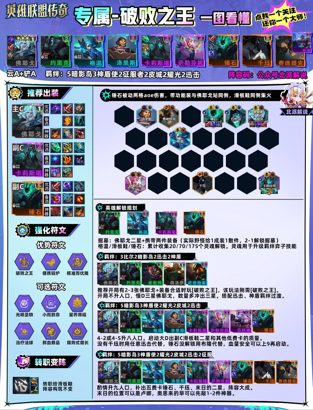 一件成装保证开局的强度,佛耶戈数量多+符文提供3张快速三星保证三阶段的强度。
