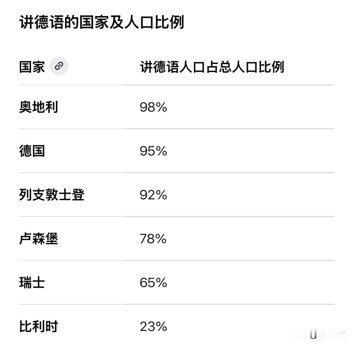 德语是官方语言的国家以及各国讲德语的人口比例。这些国家包括德国、奥地利、瑞士、比利时、卢森堡和列支敦士登。 值得注意的是,德语是德国、奥地利和列支敦士登唯一的官方语言。在瑞士、比利时和卢森堡,德语是多种官方语言之一。在比利时,讲德语的人口主要集中在东部地区。虽然卢森堡的比例为78%,但其中大多数是将其作为第二语言使用。