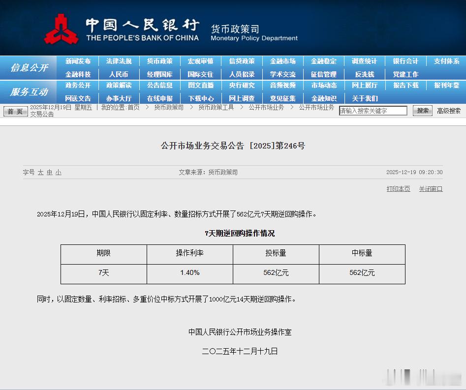 市值瞭望 央行今日开展562亿元7天逆回购操作,操作利率为1.40%,与此前持平。同时,以固定数量、利率招标、多重价位中标方式开展了1000亿元14天期逆回购操作。