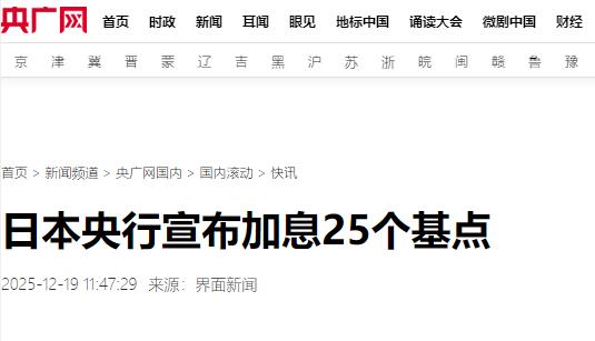 日本央行宣布加息25个基点! 日本央行这次是真的动真格了。当地时间12月19日,为期两天的货币政策会议刚结束,央行就抛出了重磅决议:把当前0.5%的政策利率直接上调25个基点,最终定格在0.75%。 这可不是小打小闹的调整,翻看日本经济史就知道,这是近30年来的最高利率水平,意味着日本彻底告别了持续十年的超宽松货币时代,也标志着央行对抗通胀的决心已经摆到了台面上。 加息消息一出,日本央行行长植田和男当天就召开了新闻发布会,把话讲得明明白白。他说这次加息不是拍脑袋决定的,核心原因就是通胀数据一直站得住脚。 日本核心CPI已经连续33个月达到或超过央行设定的2%目标,12月公布的最新数据更是同比上涨3%,比上个月的2.7%还高,物价上涨的势头已经稳住了。 现在支撑工资上涨的条件也够充分,劳动力市场短缺得厉害,非制造业的“人手不足”指数都快赶上泡沫经济时期了,2025财年最低工资同比涨了超5%,创了历史最高,企业利润也在高位,这些都给加息提供了基础。 不过植田和男也特意安抚市场,说虽然加息了,但当前的金融条件依然是宽松的。他打了个通俗的比方,说这次调整是“为实现稳定增长而适当松油门,而非对经济踩刹车”。 之所以这么说,是因为日本经济刚经历了小波折——2025年7到9月,经济出现了六个季度以来的首次负增长。但在植田和男看来,这只是暂时性的回调,经济整体温和复苏的态势没改变。 可能有人会觉得,日本央行怎么突然这么强硬?其实这不是突然的决定,而是近两年政策调整的延续。要知道,日本之前实行了长达十年的负利率政策,直到2024年3月才首次退出,把政策利率从-0.1%上调到0-0.1%的区间。 到了2024年7月,又再次加息15个基点,利率来到0.25%;再加上这次的25个基点,一年多的时间里,日本央行已经完成了三次加息,一步步把利率从负区间拉到了30年高点。这背后的核心逻辑,就是和持续的通胀“死磕”。 对普通人来说,通胀带来的感受太直观了。自2023年以来,日本的生活必需品价格就没停过上涨,2023年全年涨幅达到6.2%,创下了有可比数据以来的最高纪录。 到了2024年,这股势头也没减弱,食品、能源、原材料价格因为日元贬值不断走高,普通人去超市购物都能明显感觉到压力,不少家庭都开始精打细算过日子。 也正是因为企业和民众的压力越来越大,日本央行才不得不加快加息的步伐。之前市场就已经预测到央行可能会在2025年加息,只是没想到会在12月就落地,而且幅度达到25个基点。 不过这次加息也算是“意料之中”,毕竟核心通胀已经连续这么久达标,再加上工资上涨的预期越来越强,日本工会总联合会已经设定了2026年工资涨幅5%以上的目标,经济团体联合会也表态会推动工资上涨进一步稳定,这些都给了央行加息的底气。 但加息就能解决所有问题吗?恐怕没那么简单。有专家分析,日本经济现在的“内忧外患”都很突出,拉动经济的“三驾马车”全出了问题。 个人消费因为物价上涨出现负增长,民众想买的东西买不起;企业设备投资也是负增长,大家都不敢轻易花钱扩产;出口也在下滑,国际贸易带来的利润越来越少。 虽然日本政府之前出台了不少刺激政策,比如扩大财政开支、给能源和汽油提供补贴、给低收入家庭发现金,还鼓励企业加薪,但效果都不明显。 现在特朗普政府推行“美国优先”政策,虽然目前还没提及对日本加征关税,但日本企业已经慌了神。有民调显示,四成的日本企业认为美国政府的政策会给日本经济带来负面影响,在美日企的担忧比例更是超过七成。 要知道,日本是资源匮乏的外向型经济体,国际局势和供应链的稳定对它来说至关重要,一旦美国出台不利的贸易政策,对日本经济的打击可能不小。 这次加息也引发了市场的广泛讨论。有券商分析认为,虽然这次加息幅度不小,但市场之前已经有了充分预期,而且当前日元套息头寸的平仓压力较低,再加上美国经济增长有韧性,不会出现2024年7月那次加息后日股剧烈调整的情况,后续日股还有上涨空间。 日本央行这次加息25个基点,是无奈之举也是必然选择。持续十年的超宽松货币政策虽然在一定程度上支撑了经济,但也带来了通胀高企、货币贬值等副作用,现在到了不得不调整的时刻。 只是这条路并不好走,既要对抗通胀,又要保证经济不陷入衰退,还要应对外部环境的不确定性,每一步都得小心翼翼。植田和男把希望寄托在2026年的春季劳资谈判上,希望工资上涨能带动内需改善,让经济进入良性循环。 但从目前的情况来看,日本经济要想彻底走出困境,光靠加息远远不够,还需要解决老龄化、少子化等深层次问题,更要在复杂的国际环境中找到稳定的发展方向。至于这次加息的效果到底如何,恐怕还需要时间来检验。