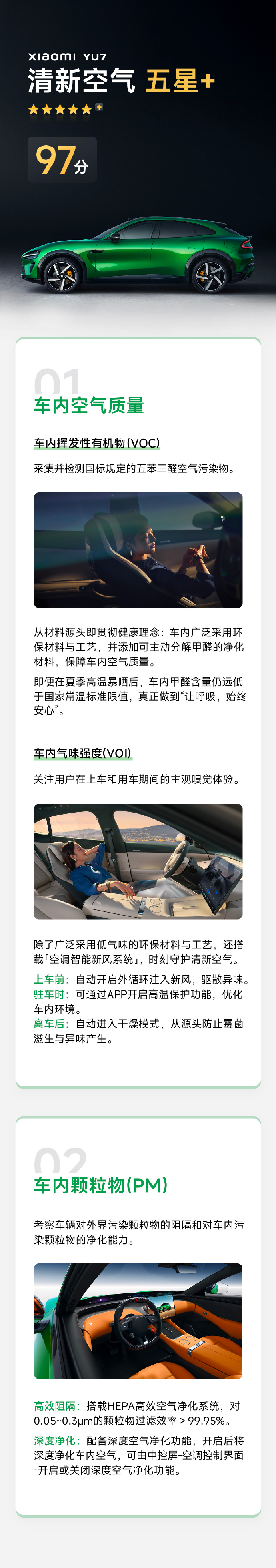小米又拿奖了?小米YU7获得获五星健康车认证看了一下,这个奖项主要是从三个维度评判的——清新空气、健康防护、绿色出行而小米YU7,无论从哪个维度上看,都拿下了最高评级展开来说比如这个清新空气,它就看你的车内空气质量和车内颗粒物,尤其是现在冬季雾霾有点强,但YU7配的HEPA高效滤芯,那它的对于整个车内空间空气的净化能力,也确实实打实的有效,而且只要你看过YU7的拆车视频,就知道这个大的离谱,然后是健康防护,小米的内饰大面积用的是婴幼儿级的环保材料,像空调滤芯,冰箱这些设备,也充分考虑了抗菌防霉的需求,车内电磁辐射更是做到了手机相当的水平绿色出行就不用我多吹了吧,小米的续航表现那是在各个媒体的实测上都榜上有名的,能耗控制强的离谱我最直观的感受就是,哪怕我开车出去停在户外,经过太阳暴晒,车里也没什么异味,而且我有两个小孩,经常到家之后还不愿意下车,在车上到处摸,到处爬,我就很放心无论是显性的配置,还是隐性的材料,小米都给用户拉满了,我现在倒是很期待,YU7都发了大半年了,还能挖掘出什么惊喜,真就是时间越久,越证明这个车的含金量