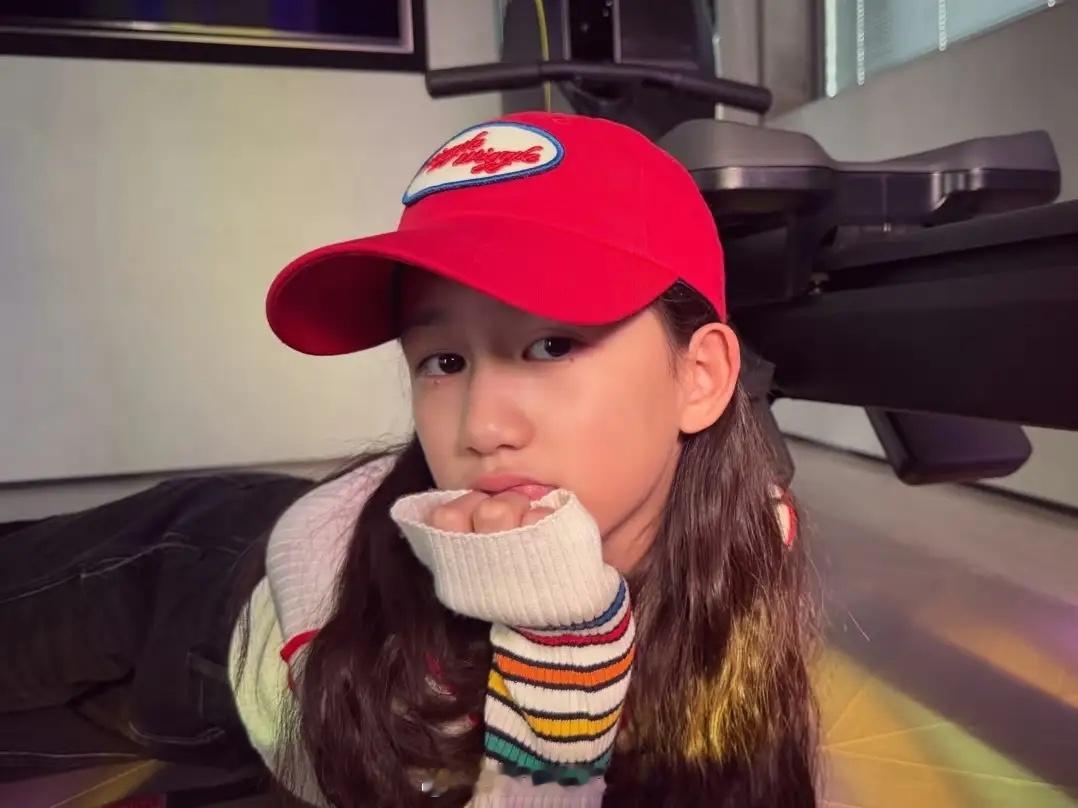 黄磊老婆孙莉,晒二女儿黄少艾的照片。12岁的多妹戴着红色的棒球帽,还染了发色,