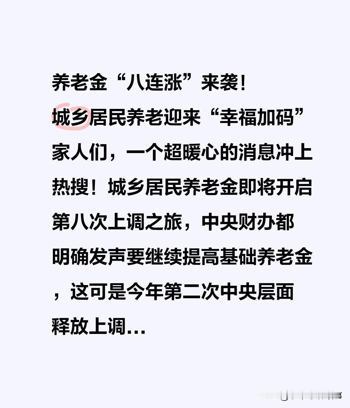 养老金“八连涨”将至!城乡居民养老幸福升级 家人们,一则暖心消息登上热搜!城乡居民养老金将开启第八次上调,中央财办明确要继续提高基础养老金,这是今年中央第二次释放上调信号,养老保障暖意渐浓! 回顾往昔,城乡居民基础养老金从每月55元起步,经七次上调,涨至如今143元。每次上调,都饱含国家对百姓养老的关怀。 如今,第八次上调在即。专家预测,2026年全国最低标准或超163元,部分地区可能破220元。这涨的是晚年底气,是稳稳的幸福。快分享这好消息,共盼美好养老生活!