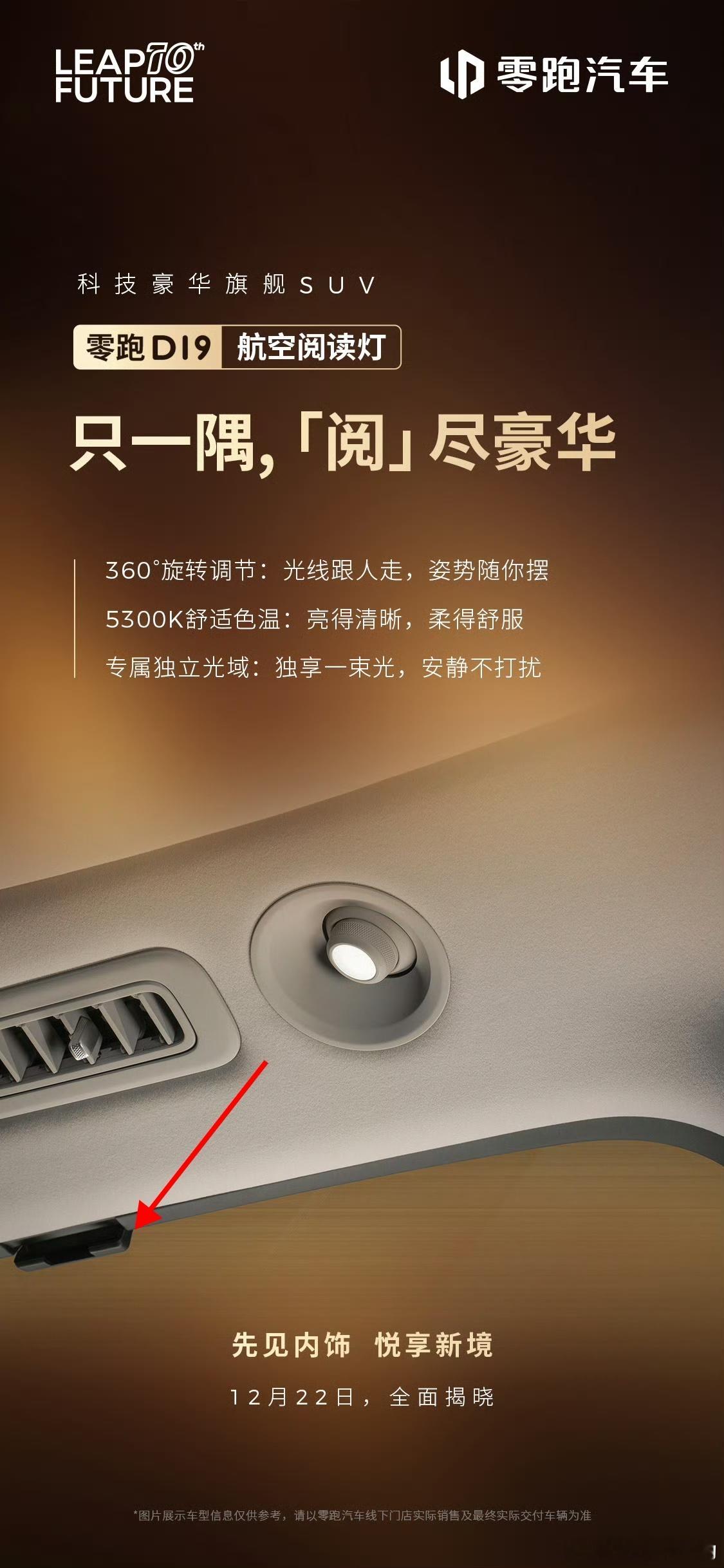 透过零跑官方发布的零跑d19 内饰图还可以看出来①二排B柱加了拉手,增加行动不便的便利性,图1②Console下端是一个标准借口还是挂钩?在这个位置,图2③二排有物理遮阳帘,图3官方信息如下:4处静奢壁灯、航空阅读灯、智能香氛每一处细节,皆为舒适体验而生