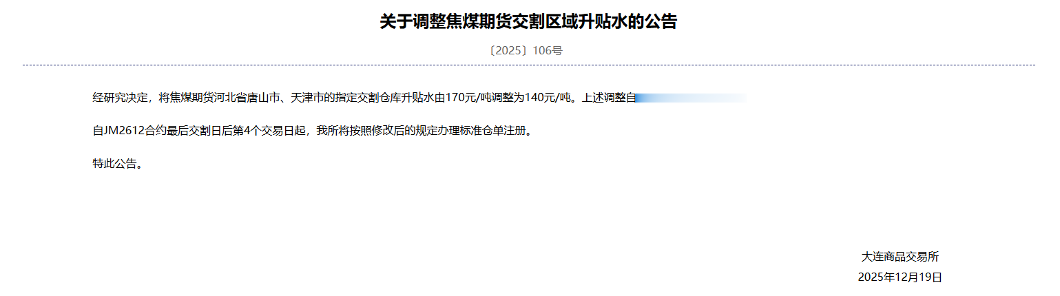 12月19日,大商所公告,经研究决定,将焦煤期货河北省唐山市、天津市的指定交割仓库升贴水由170元/吨调整为140元/吨。上述调整自JM2701合约起实施。自JM2612合约最后交割日后第4个交易日起,我所将按照修改后的规定办理标准仓单注册。