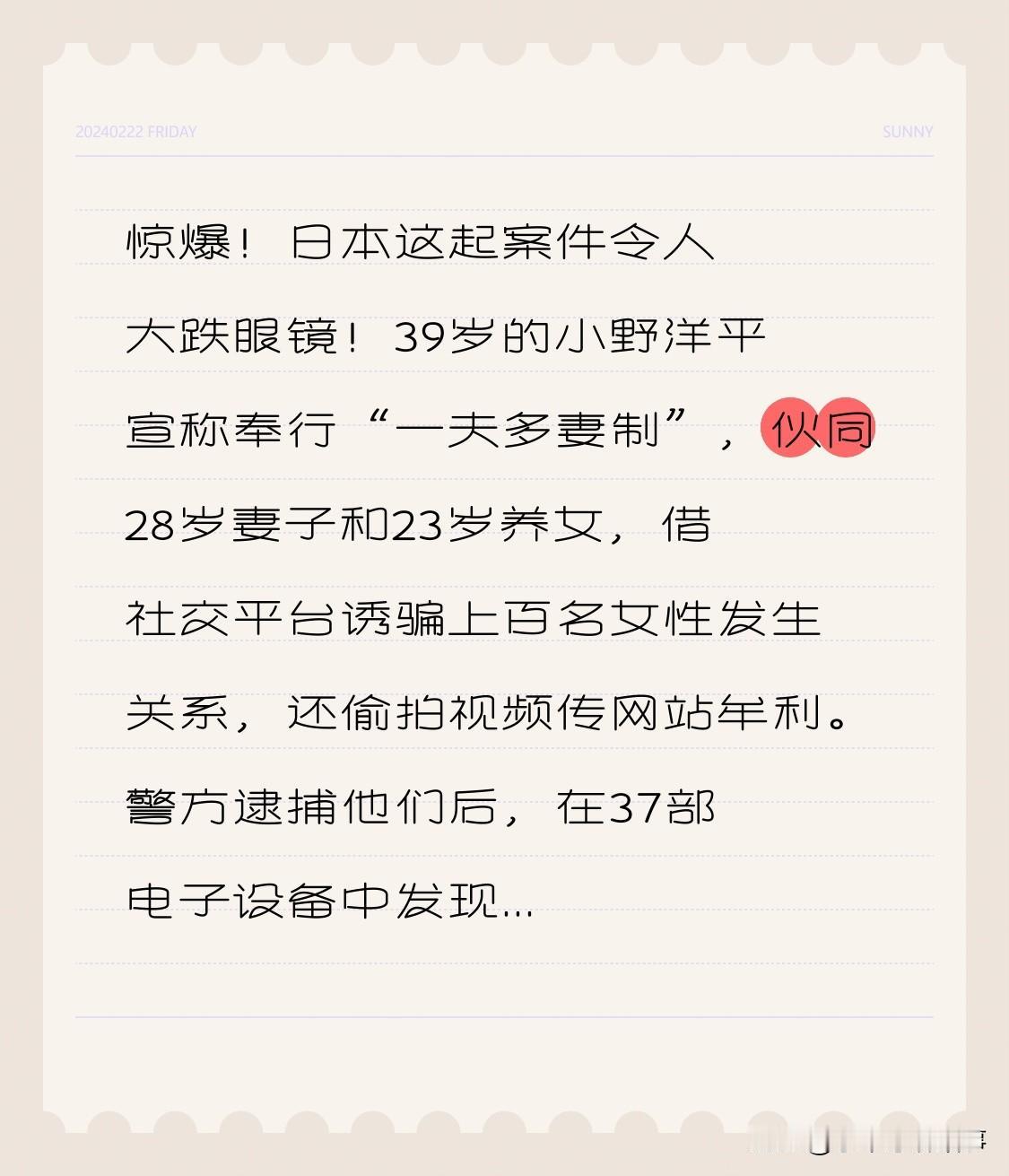 惊爆!日本这起案件令人大跌眼镜!39岁的小野洋平宣称奉行“一夫多妻制”,伙同28岁妻子和23岁养女,借社交平台诱骗上百名女性发生关系,还偷拍视频传网站牟利。 警方逮捕他们后,在37部电子设备中发现约860段涉约100名女性的淫秽视频。小野洋平供认恶行持续约两年三个月,获利超5000万日元。他去年11月就因非法拘禁少女被捕,不知还有多少受害者。此家人恶行恶劣,必受法律严惩! 日本人婚姻 日本外遇 日本性犯罪
