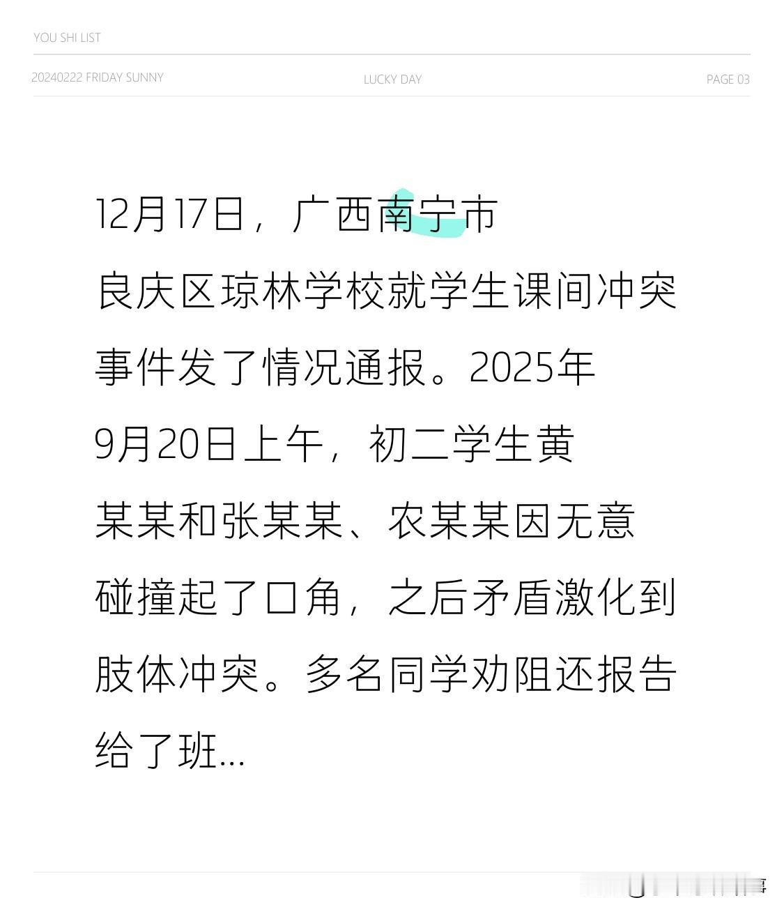 震惊!12月17日,广西南宁市良庆区琼林学校针对学生课间冲突事件发布情况通报。2025年9月20日上午,初二学生黄某某与张某某、农某某因无意碰撞起了口角,矛盾升级为肢体冲突。多名同学劝阻并告知班主任,班主任及时制止,带受伤的黄某某就医。 学校高度重视,派人调查、慰问学生、安抚家长。经协商,为黄某某调整班级和宿舍,处分农某某和张某某,安排心理老师疏导。学校将强化管理,守护孩子成长。此次通报回应了此前网上的霸凌传言。