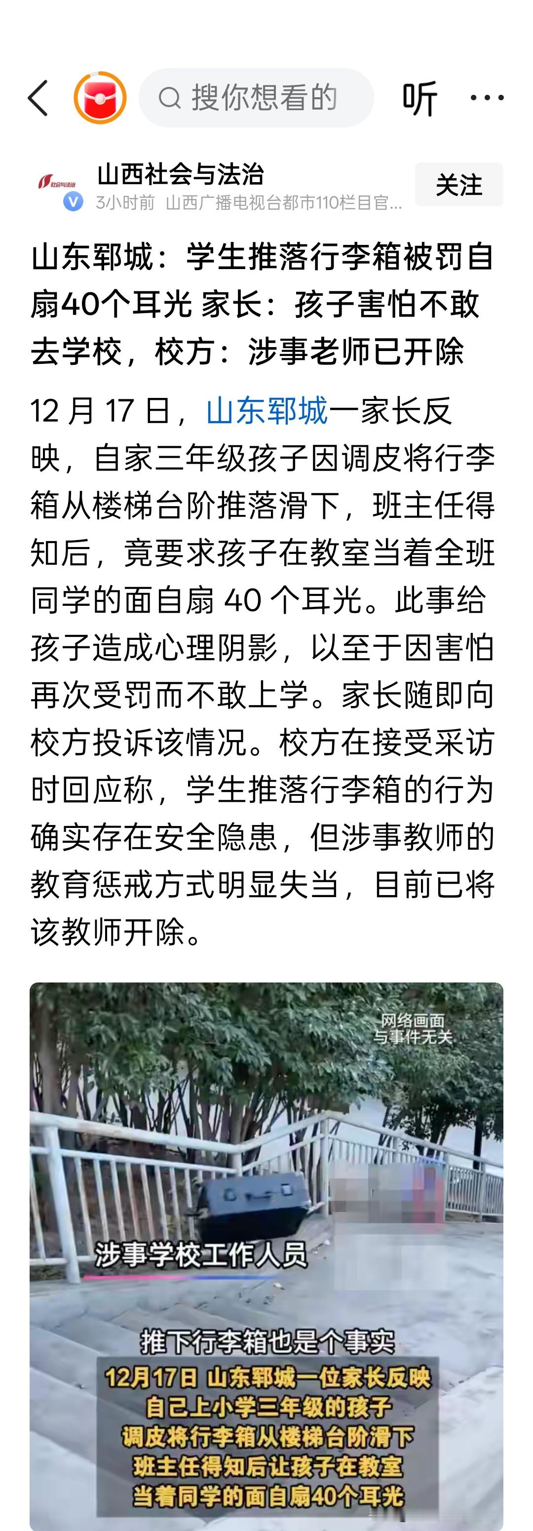 山东郓城:学生推落行李箱被罚自扇40个耳光 家长:孩子害怕不敢去学校,校方:涉事老师已开除
