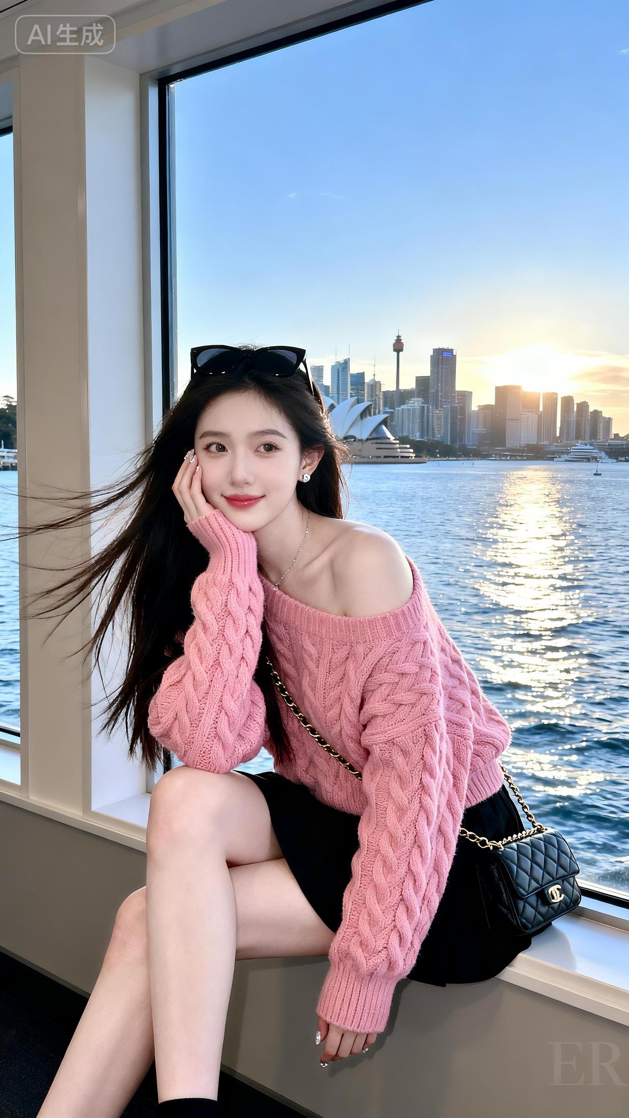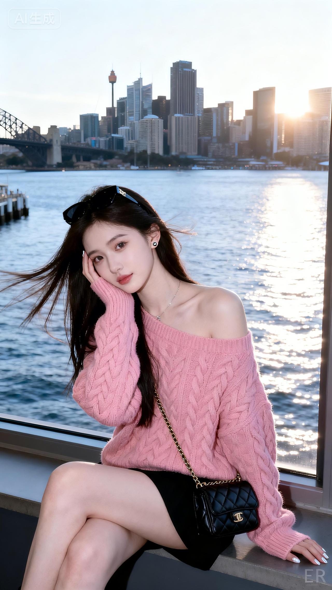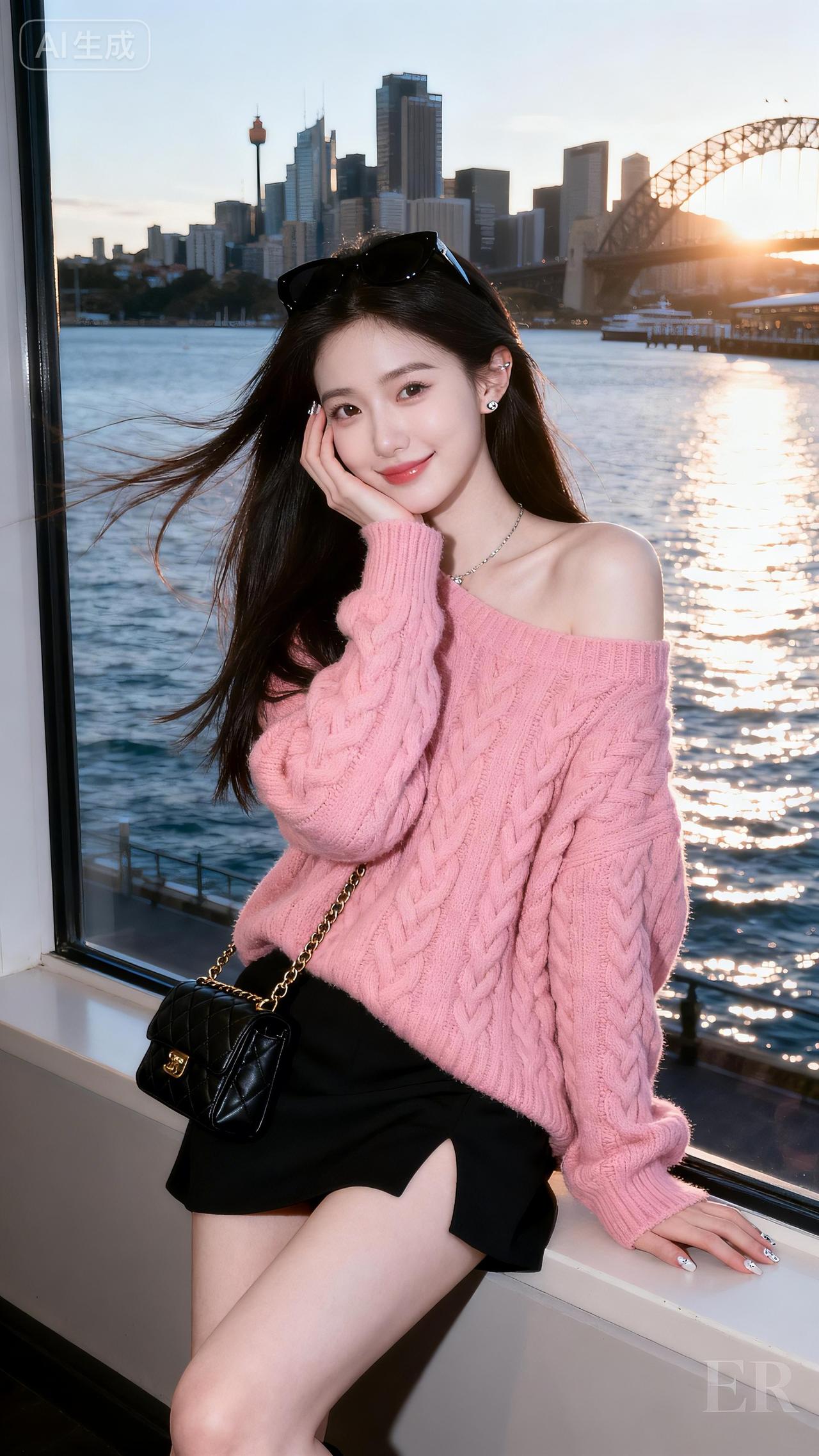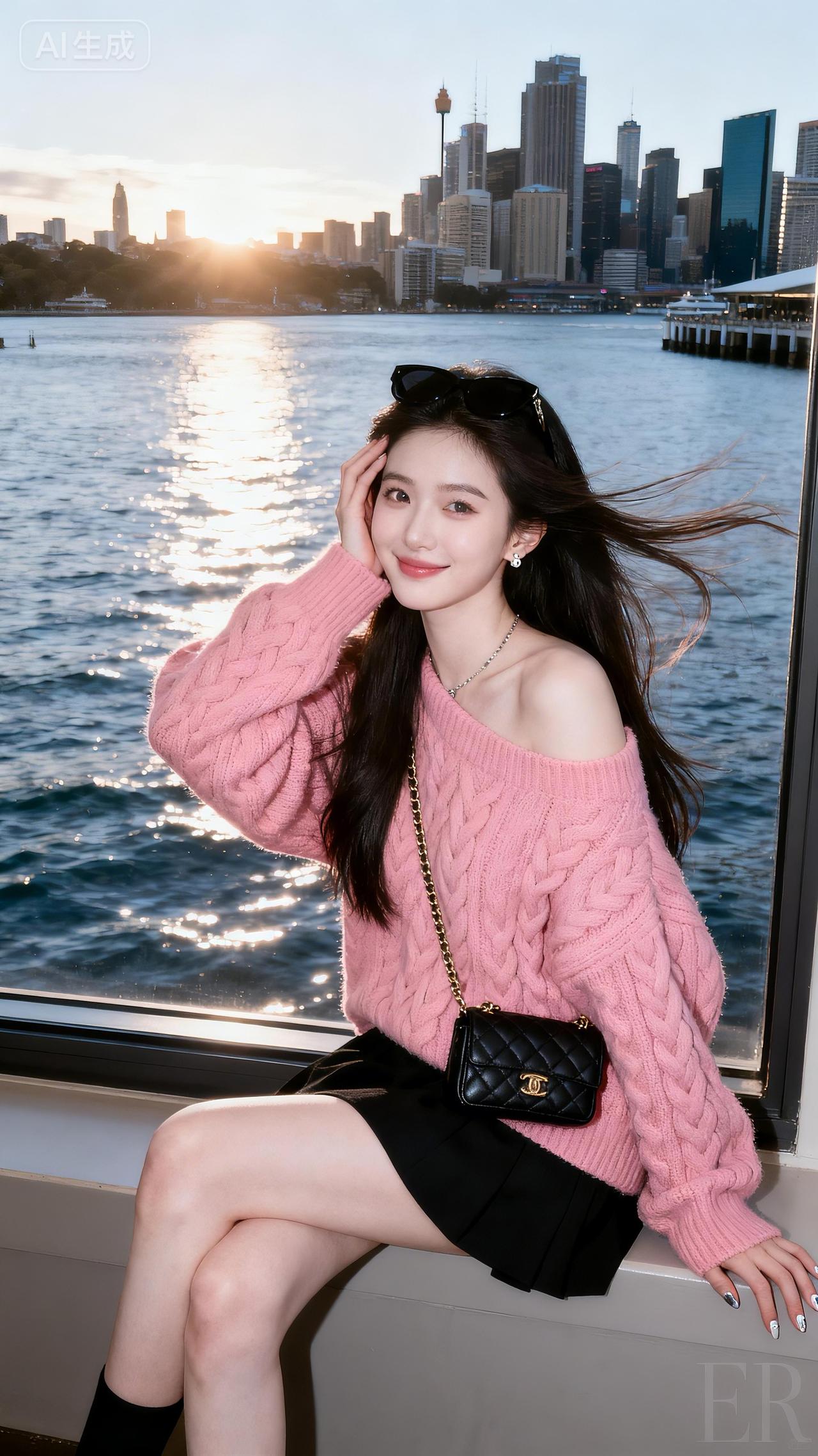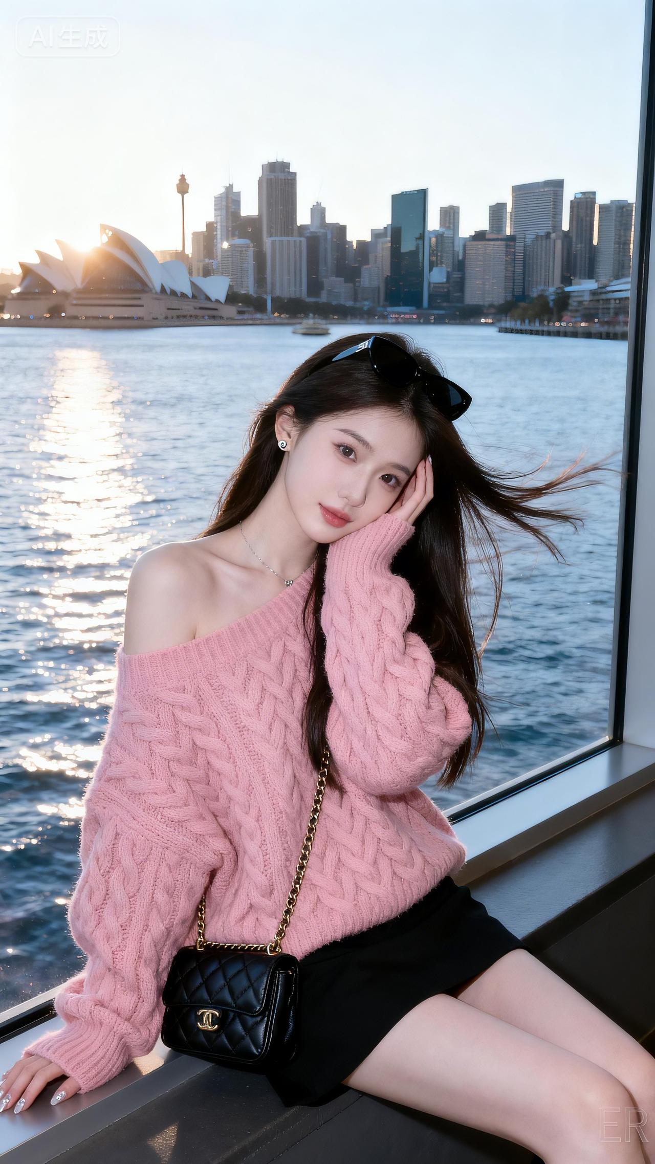 江风裹着粉毛衣,露肩角蹭过舷窗的光,黑包链晃出都市的甜。夕光浸了城景,连发丝都沾着港边的软。 都市氛围感穿搭江衡穿搭