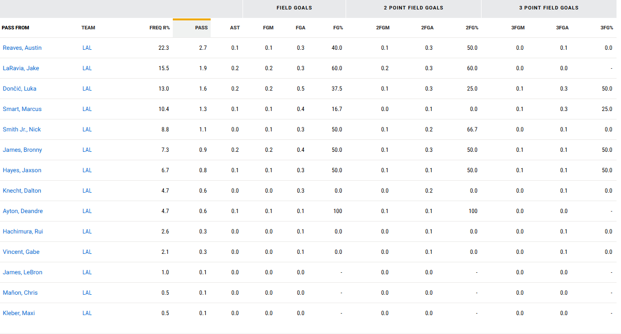 另外,我对于“如何在进攻端包容范德比尔特”的想法是——重点不在于他场均能不能进1个三分或者是他三分命中率能不能达到30%——重点在于,湖人应该少向他传球。除非是他切入进来了、能直接上,或者是能再处理(内传内/分球),否则要尽量减少给定点状态下范德比尔特传球的频率。范德比尔特可以增加东契奇/里夫斯/詹姆斯的出手难度,但他不应该吃掉东契奇/里夫斯/詹姆斯的出手份额。什么叫“包容”范德比尔特的进攻?不是向他索求更多回报,而是得就把他当个挂件、在大部分时间做好4打5得分的准备。范德比尔特的出手机会。应该来源于“额外回合”——我不希望他站定点,我希望他每个回合都去看有没有切入机会、都去抢进攻篮板。在赛季初拉拉维亚大吹范德彪的三分、季前赛范德比尔特场均出手3-4次三分的时候,我就说过范德彪更多站定点一定是“陷阱”,最终结果只会导致他上不了场——事实证明,他真的上不了场了。现在,他又有了“第二次机会”,他一定要把握住——这不仅关于他自己,也关于全队。我给大家看两张数据图,逻辑可能不严谨,但是也能看出一些东西:图1:范德比尔特22-23赛季全明星后23场比赛,在场均24分钟情况下的接到传球次数;图2,2025-26赛季范德比尔特在场均17分钟下的接到传球次数。22-23赛季,范德彪上场24.3分钟,触球27.7次,平均每分钟触球1.14次;25-26赛季,范德彪上场17.2分钟,触球26.0次,平均每分钟触球1.51次;一个进攻不好的球员,你让他触球次数增加,就会放大他进攻端的“毒性”。而且大家发现一个问题没有?22-23赛季,范德比尔特接到最多的传球来源于浓眉;25-26赛季,范德彪接到最多的传球来自于各位控球手(甚至是进攻能力一般的球员)。这两种传球分别对应哪些比赛画面?哪种是好传球哪种是可能不好的传球?大家可以自行想象一下。 洛杉矶湖人