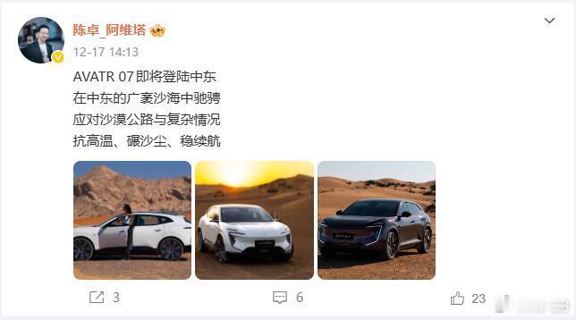 阿维塔07即将登陆中东 阿维塔科技总裁今天发博表示,阿维塔07即将登陆中东市场。后续他们还会进军哪里呢 新能源汽车汽车资讯
