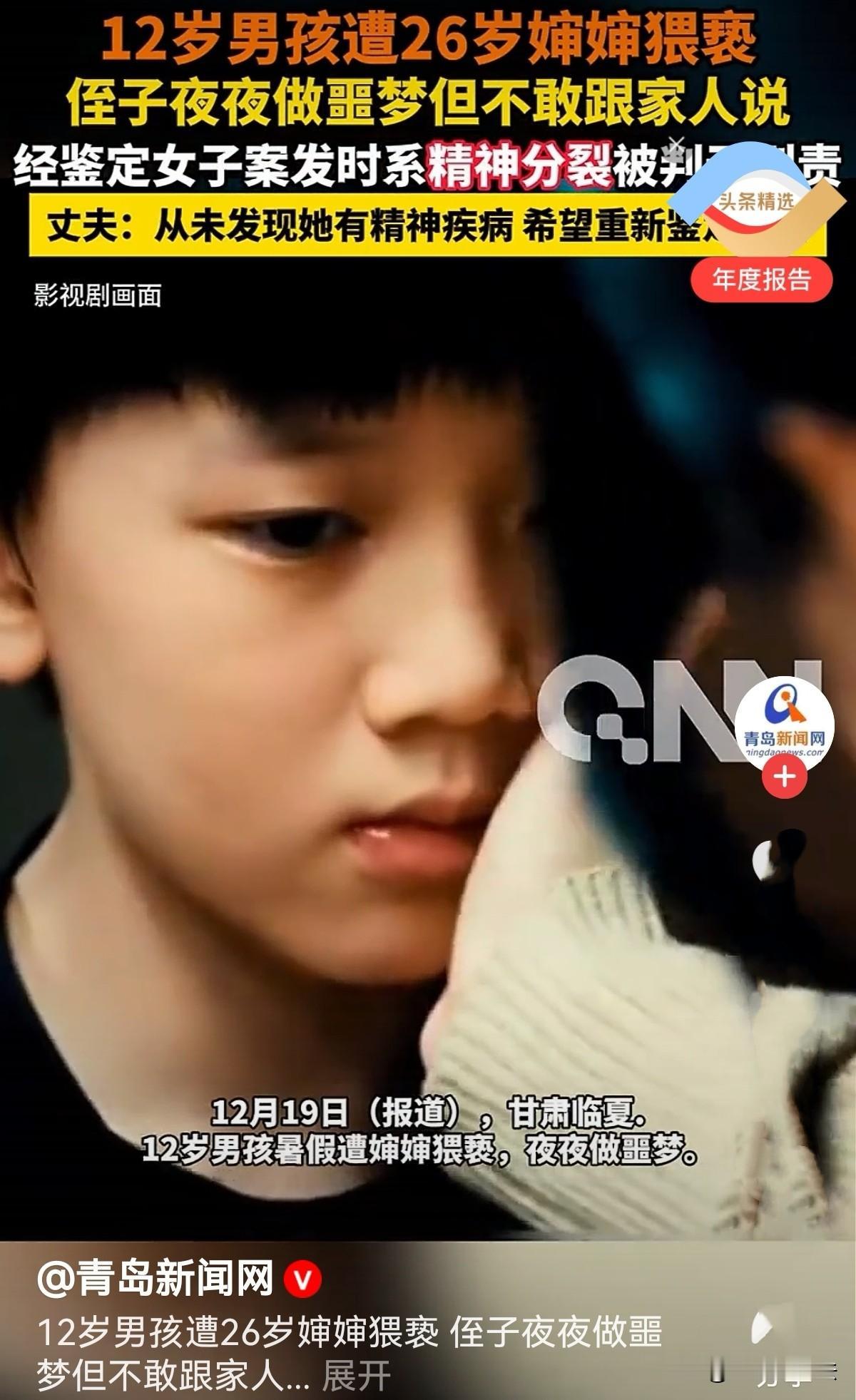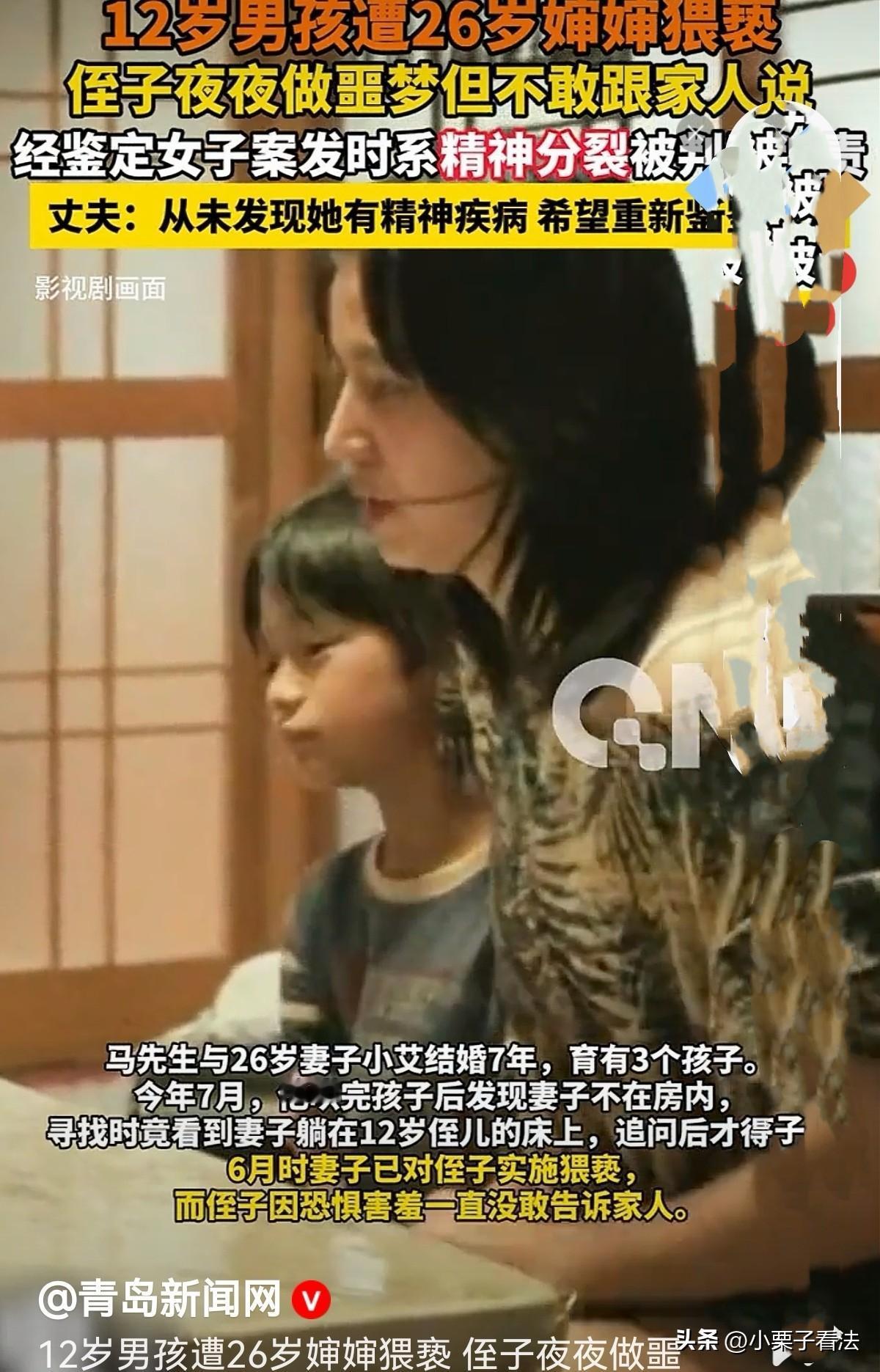 甘肃临夏,男子与妻子结婚7年,已育有3个孩子,两人却因矛盾闹起离婚。男子哄3个孩子睡觉后,不见妻子,便起身去找,谁知,妻子竟睡在12岁侄子的床上,侄子坐在沙发上发抖。在他的质问下,妻子竟说猥亵了侄子。男子原以为妻子在气他,再问侄子方知是真。男子觉得这事不能隐瞒,告知大哥后报警。万没想到,妻子因鉴定案发时患精神分裂症,不负刑事责任。男子:为听说妻子患精神疾病,要求重新鉴定,追究她的刑事责任。 马先生与26岁妻子小艾结婚7年,育有3个子女,本来一家5口可以安稳幸福地过小日子,可两人却因小小不然的事,闹起了离婚。 这下,小艾对3个孩子不管不问,马先生可忙乎坏了,下班后还得管孩子。 2025年7月3日晚上11点多,马先生把3个孩子哄睡后,疲惫地起身回房,想着这样下去不是个事,得和妻子好好谈谈。 回到房间,他发现妻子并不在房内,他很奇怪,这么晚了她去哪里了?于是,他又出去找妻子。 他看到12岁侄子小进的房间亮着灯,便推门进去,结果竟发现妻子在睡在侄子的床上,而侄子则坐在沙发上,神情恍惚,身子在微微抖动。 当时马先生也没往别处想,拉妻子起来回自己房间,质问她为啥睡在侄子床上? 小艾不以为然说:睡那怎么了?我把他猥亵了!马先生以为妻子和自己赌气,故意气他的,婶婶怎么会对孩子做这事!不可能! 谁知妻子又说其实她早在6月30日傍晚,就对侄子做了这种事情。 马先生这下有些半信半疑,加上刚刚看到小进的神情不对,于是他又去询问侄子,结果侄子哭着说是真的。 马先生如五雷轰顶,这女人怎么能做出这么没品没德的事啊!简直是没人性!自己怎么跟大哥大嫂交代啊! 大哥大嫂在外地打工,侄子也在外地上学,因六年级放假较早,小进就回到老家看望奶奶,他住的房间与马先生的房间挨着。 对于12岁的孩子,婶婶对他做的事,他一直不敢告诉叔叔和家人,一直自己承受着恐惧与羞辱。 在叔叔的询问下,他再也绷不住了,哇地哭出了声。 马先生一宿没睡,天一亮他就给岳父打电话,告知此事并让他把妻子领回去,同时提出离婚与赔偿。 万没想到当晚,侄子就不见了。马先生的心一下子提到了嗓子眼,他喊上亲戚朋友,挨家挨户地找,村里的犄角旮旯翻了个遍。 直到第二天下午,才在镇上一家小宾馆的角落里找到了缩成一团的孩子。孩子的眼睛红肿着,看见他,哇的一声又哭了起来。 马先生的心像被揉碎了一样疼。他知道,这事瞒不住了,也不能瞒。 他拨通了大哥的电话,如实告知了此事。而后他拨打了报警电话。 警方很快介入,2025年7月23日,小艾因涉嫌猥亵儿童罪被刑事拘留。 《刑法》第237条明明白白写着,猥亵儿童要从重处罚,他盼着法律能给侄子一个公道,让小艾付出应有的代价。 然而7月26日,警方出具了一鉴定书,因小艾案发时患有精神分裂症,当时辨认及控制能力丧失,因此无刑事责任能力,也就是说,她不用坐牢。 《民法典》第1188条规定:无民事行为能力人、限制民事行为能力人造成他人损害的,由监护人承担侵权责任。 有财产的无民事行为能力人、限制民事行为能力人造成他人损害的,从本人财产中支付赔偿费用。 这个结果,让马先生和大哥当场红了眼。小自从发生这件事,晚上睡觉总做噩梦,半夜会被惊醒。 这事对孩子的心理创伤太大了!而且现在变得沉默寡言,难道说她有精神疾病就一笔勾销她所犯下的罪行吗? 马先生怀疑地说:结婚7年,从来没听说妻子有精神分裂症,她也从来没去医院看过病!除了她说过头痛,去医院检查也一切正常。 她怎么就成了精神病了?马先生与大哥一家无法接受这个结果,要求重新鉴定。 11月27日,检察院回复:申请精神病复鉴的问题,本院要求侦查机关重新鉴定,因小艾拒不配合,未能重新进行司法鉴定。 本院于10月29日向法院强制医疗申请。然而12月1日,强制医疗申请已被法院驳回。 《刑事诉讼法》第302条规定:实施暴力行为,危害公共安全或者严重危害公民人身安全,经法定程序鉴定依法不负刑事责任的精神病人,有继续危害社会可能的,可以予以强制医疗。 12月11日,马先生和哥哥已向上级法院申请复议,希望对小艾重新进行鉴定,并追究其刑事责任。 有人说,都鉴定有病,孩子爸爸还想置于妻子死地而后快?这也是夫妻一场啊,看在3个孩子妈妈的面,也不该落井下石啊! 有人说,多大点事非得闹大了!以后让孩子们怎么面对妈妈,这样的丈夫太自私,屁大点事折腾的满城风雨,置她于死地呢! 还有人说,必须重新鉴定!这就不是自家关起门解决的事!对12岁未成年的孩子的事,就不应该是小事!必须严惩! 您觉得小艾的所作所为应该得到谅解吗?