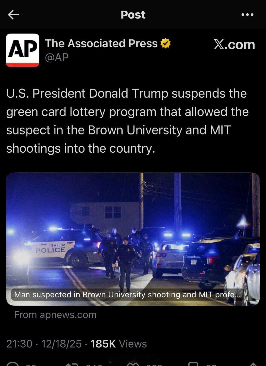 在布朗大学与MIT枪杀案后,美国政府宣布中止绿卡抽签机制。因为凶手葡萄牙人是通过