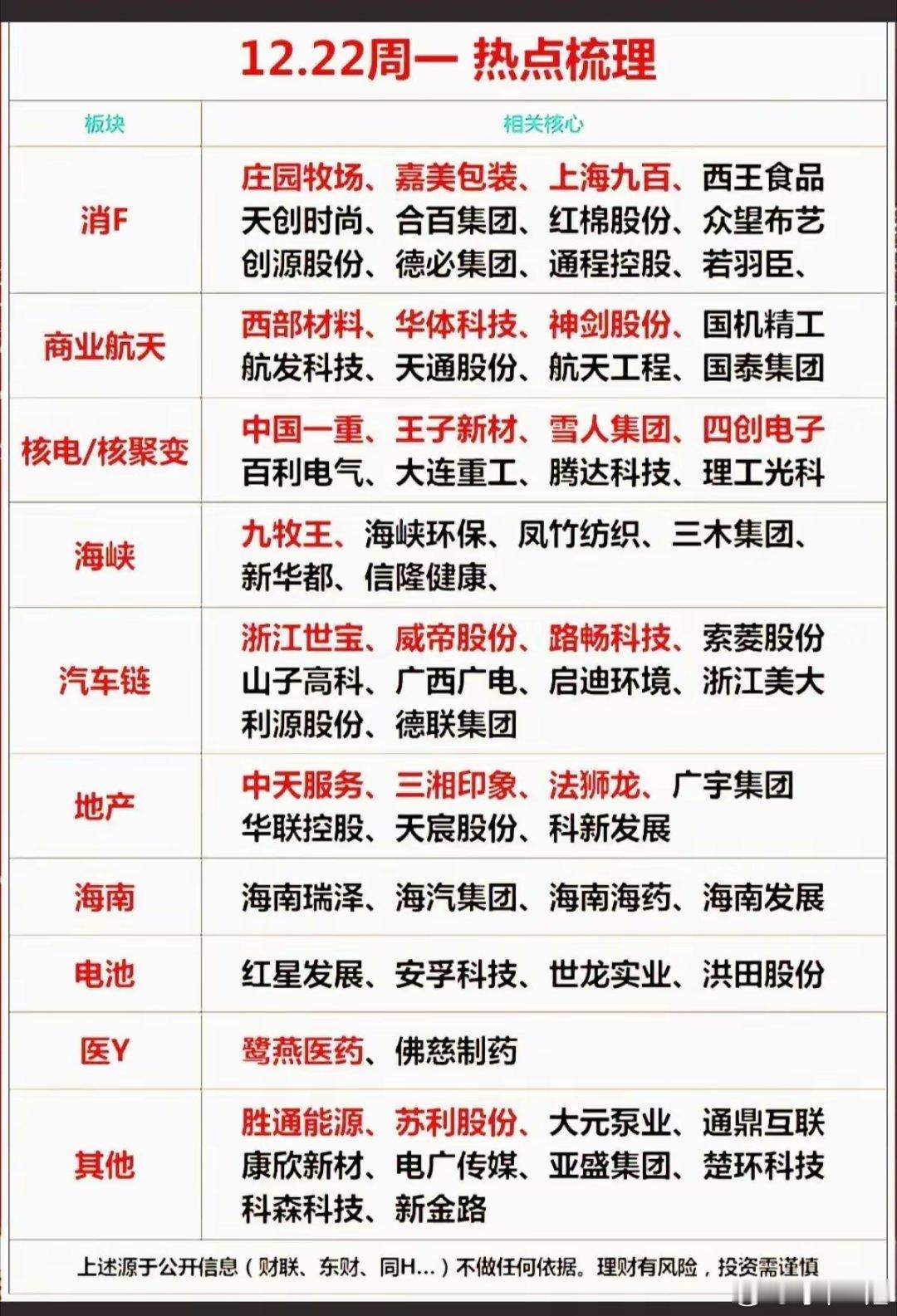 12月22日,下周一A股这些板块有望大爆发!!!消费零售:庄园牧场、嘉美包装、合百集团;商业航天:西部材料、华体科技、神剑科技;核聚变:王子新材、雪人集团、百利电气;无人驾驶:浙江世宝、路畅科技、山子高科!!!股市分析