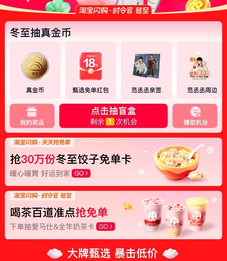 无论南圆北饺,心意都是团圆美好。无论吃什么,都别忘了给团圆加一点“真金币”惊喜。 上淘宝搜【闪购冬至】,点饺子抽真金币赢取30万份饺子免单!冬至小团圆,好运一整年。