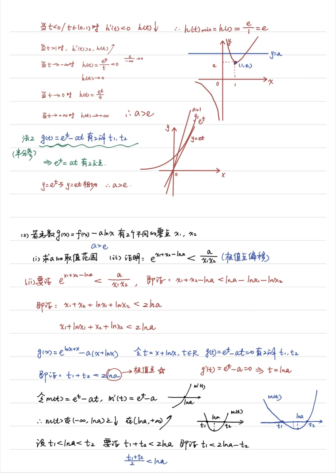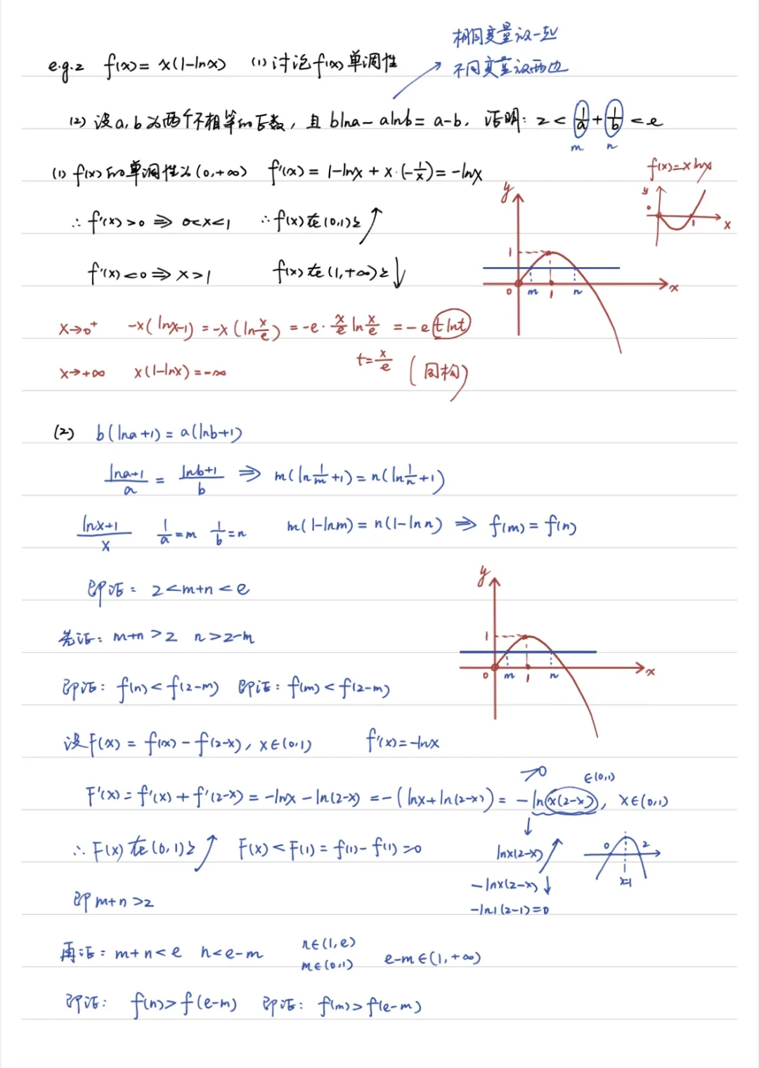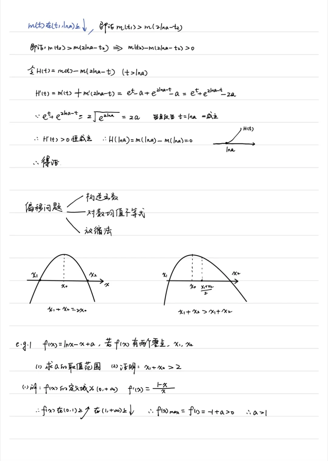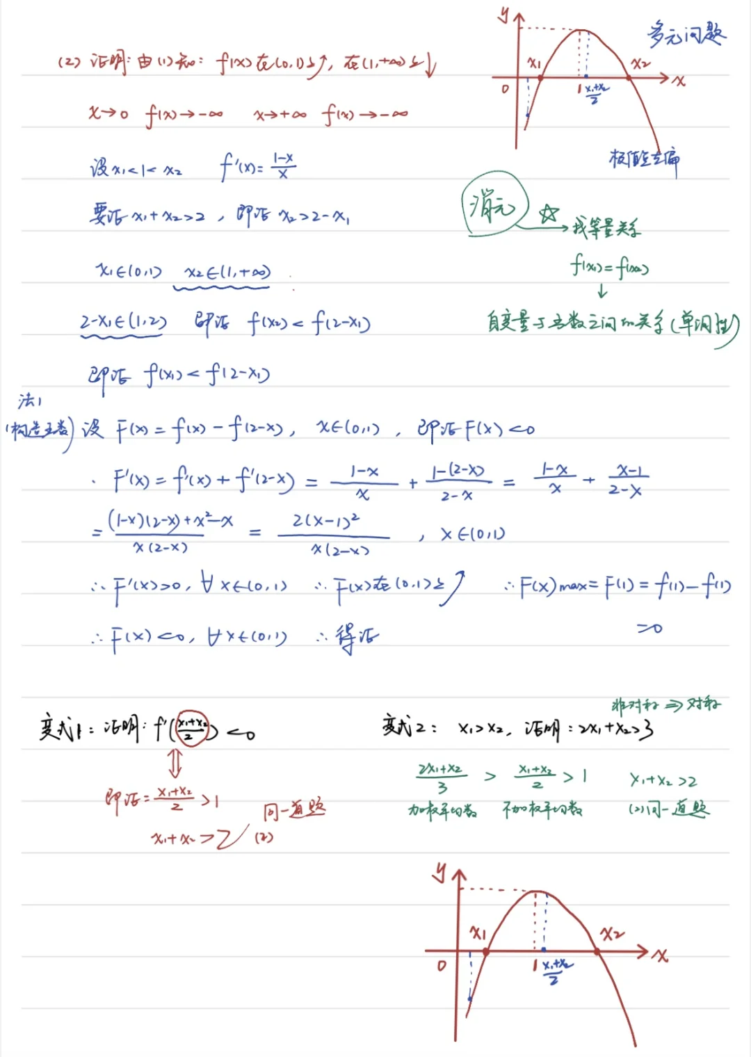 这个内容准备分两周讲。 明天上课内容的第一题算是比较全面经典的题目,里面也涉及到隐零点和同构,一题多解~一上课准备让学生挑战一下~ 后面的例题属于极值点偏移入门级的题目。处理极值点偏移的核心思想是“消元”,那就需要寻找等量关系,研究函数的单调性。 下节课讲对数均值不等式和放缩,再把今年高考18题搬出来讲。