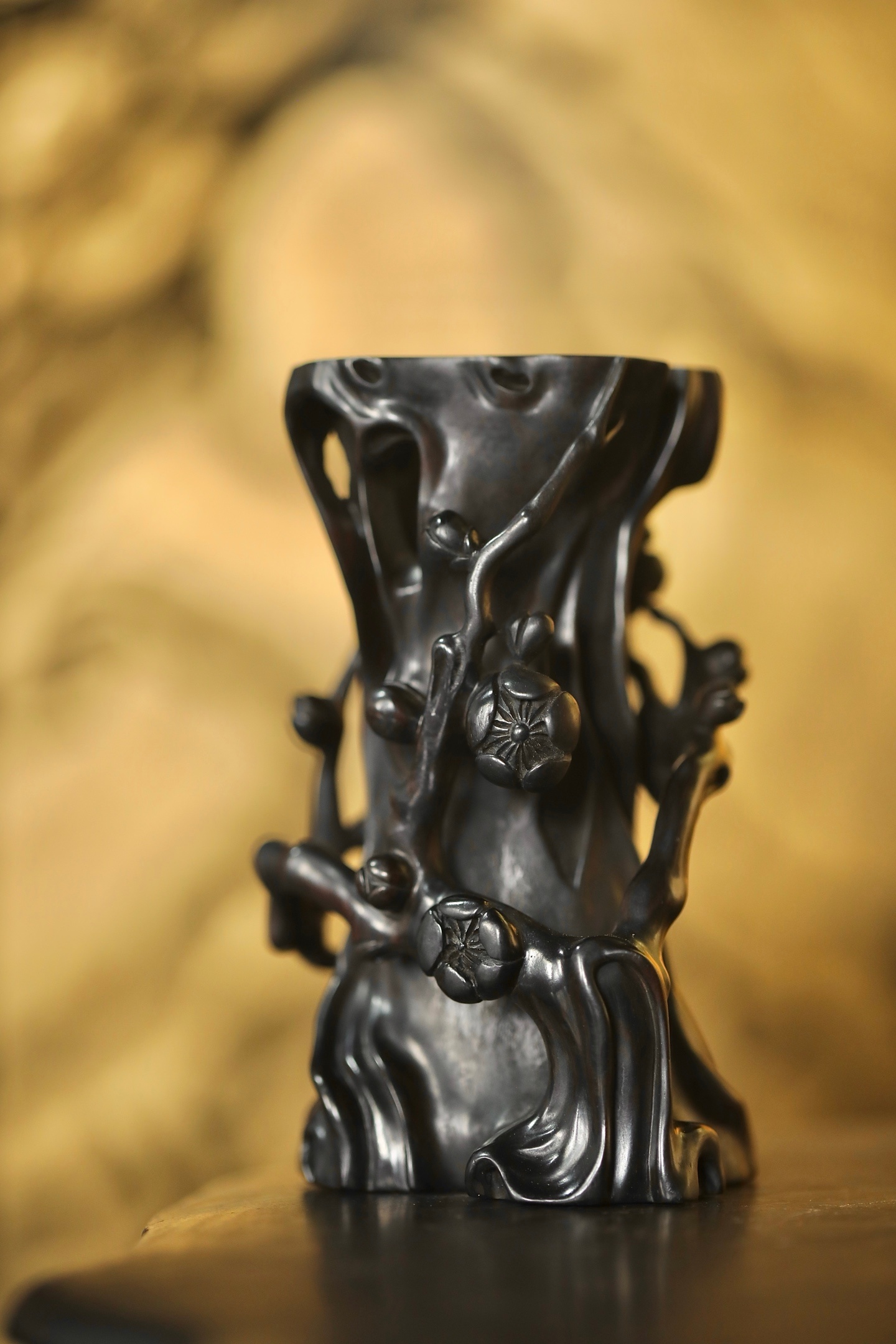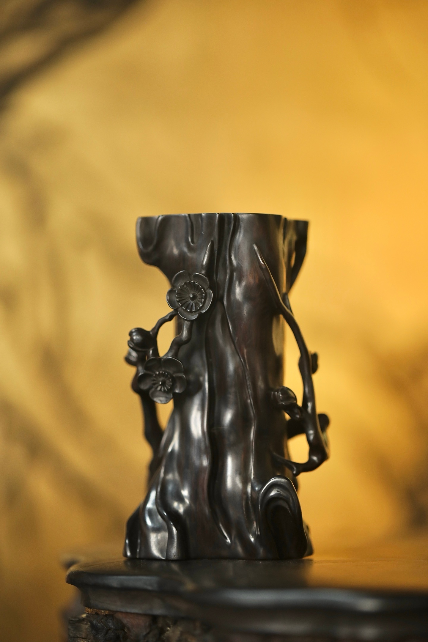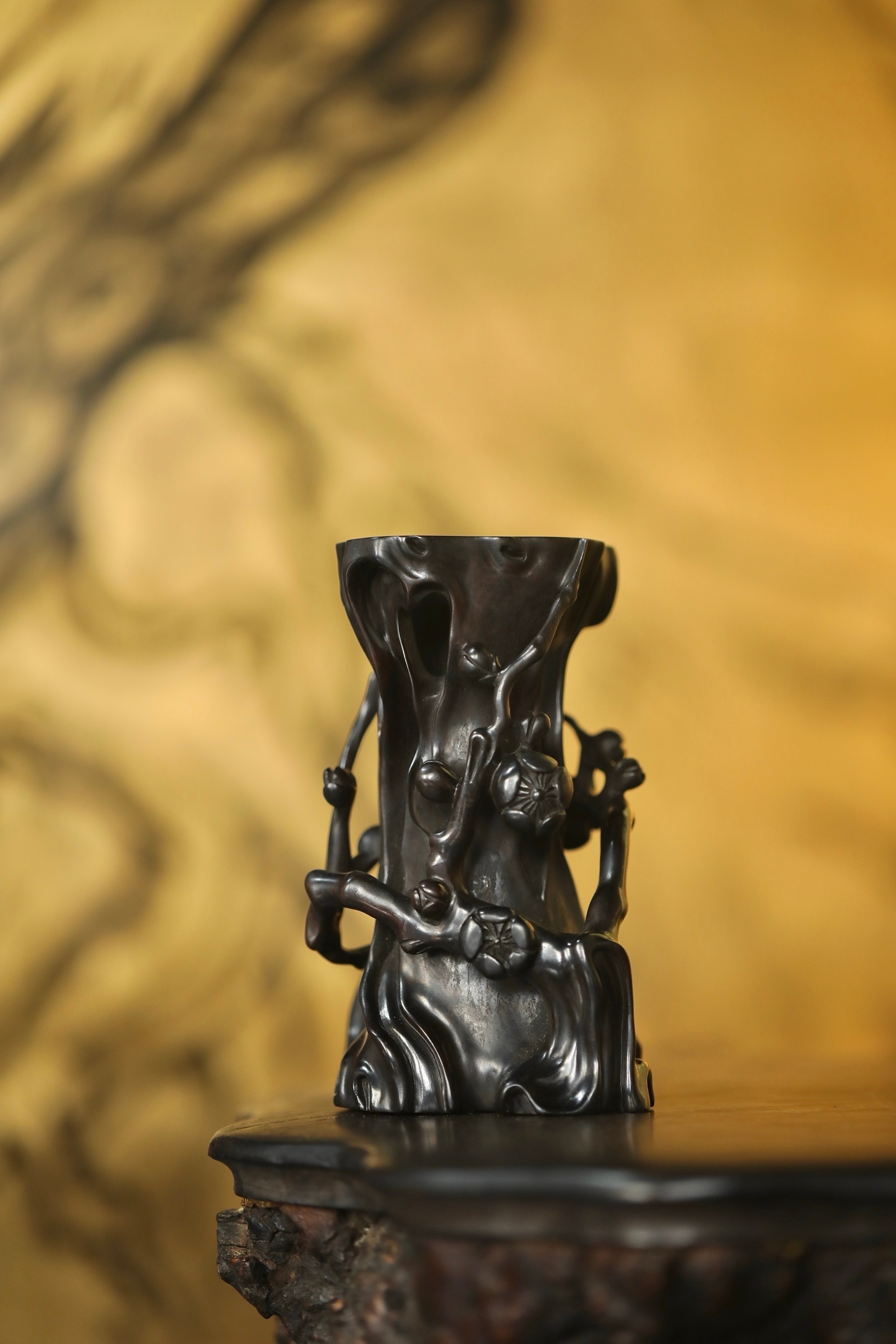 紫光檀 | 梅花花插匠人随木形雕作梅干虬曲之态,枝桠盘绕间,梅花朵朵凹凸有致,似迎寒绽放。花插中空可插细枝,置于案头,无花时见木之苍劲,插枝时融花之灵秀,一器藏尽「疏影横斜水清浅」的中式梅韵。6.8*5.7*12cm