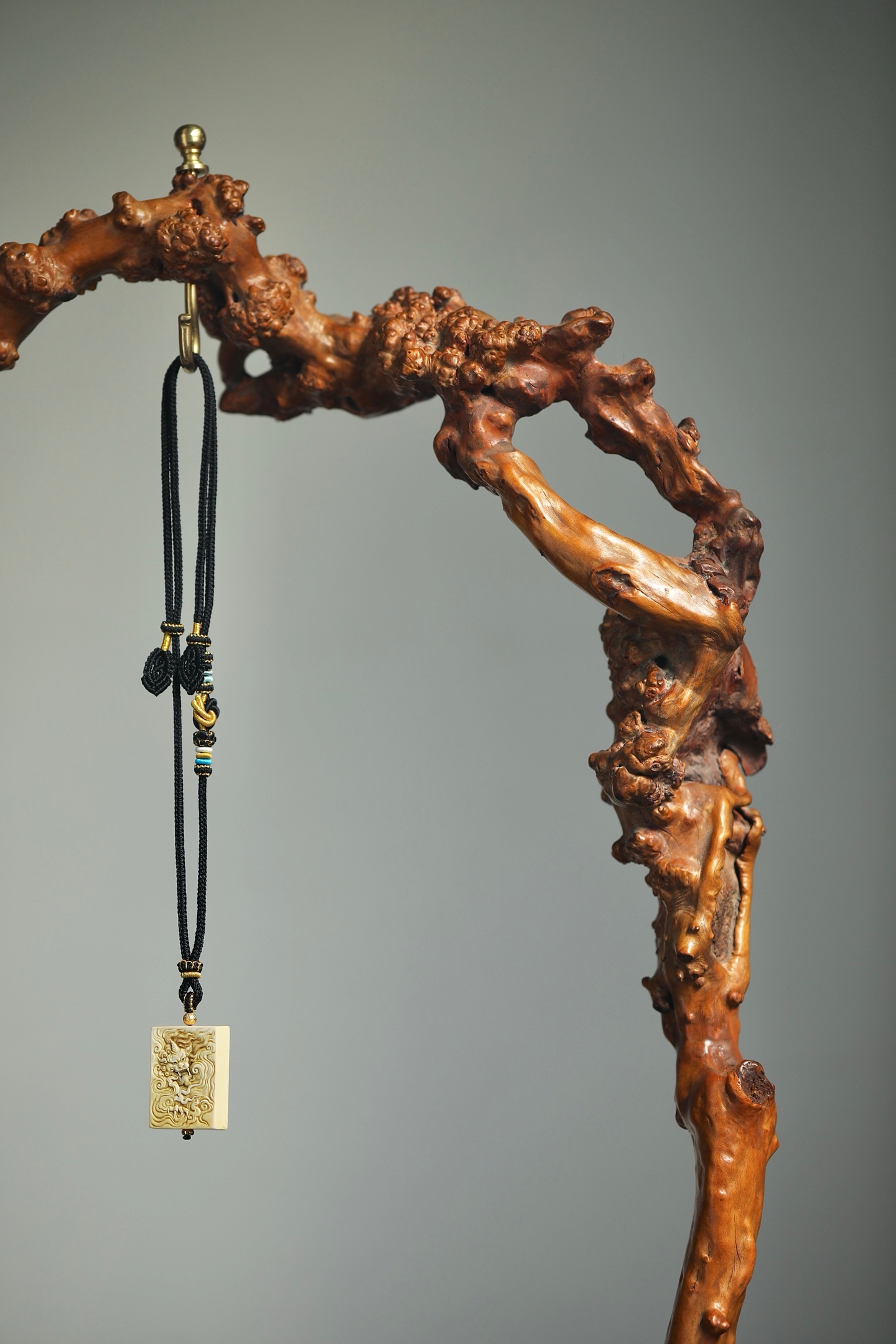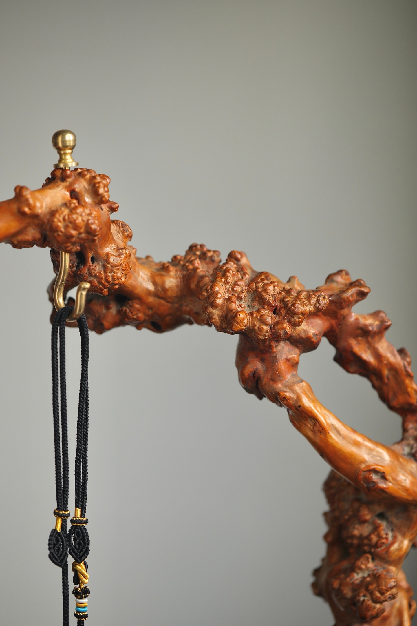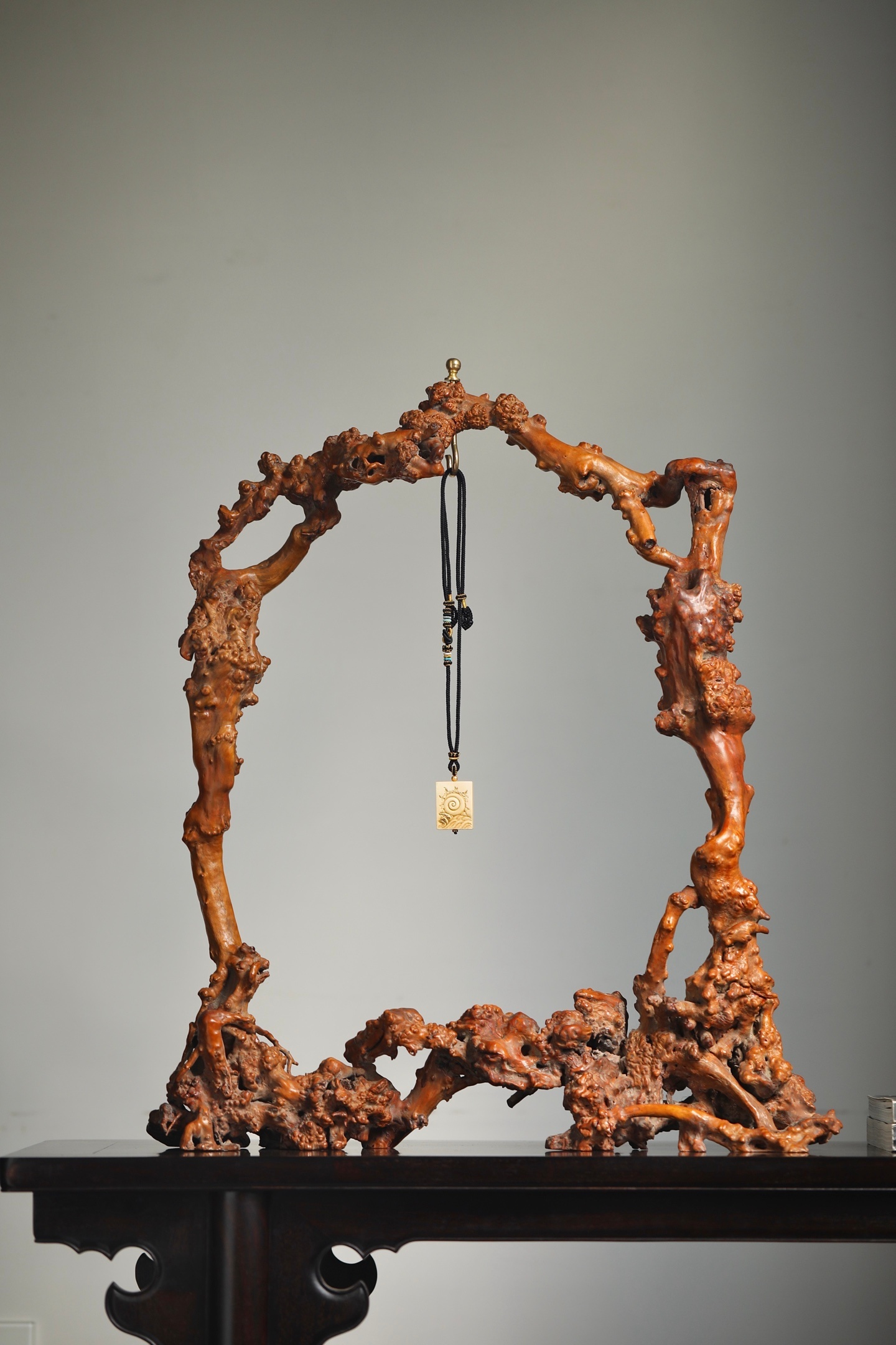 奇木 | 玉挂精选奇木天然瘤疤料制成玉挂架,保留木材原生的虬曲形态与瘤结肌理,每一处纹路都是独一无二的自然馈赠。架身依木形随势打造,无需刻意雕饰,便自带山野嶙峋之美;顶端铜质挂钮精巧实用,垂挂玉牌时,木的温雅与玉的灵秀相映成趣。既是收纳玉饰的实用器,也是中式空间里极具意境的陈设摆件,藏用皆宜。尺寸:55×14×65cm