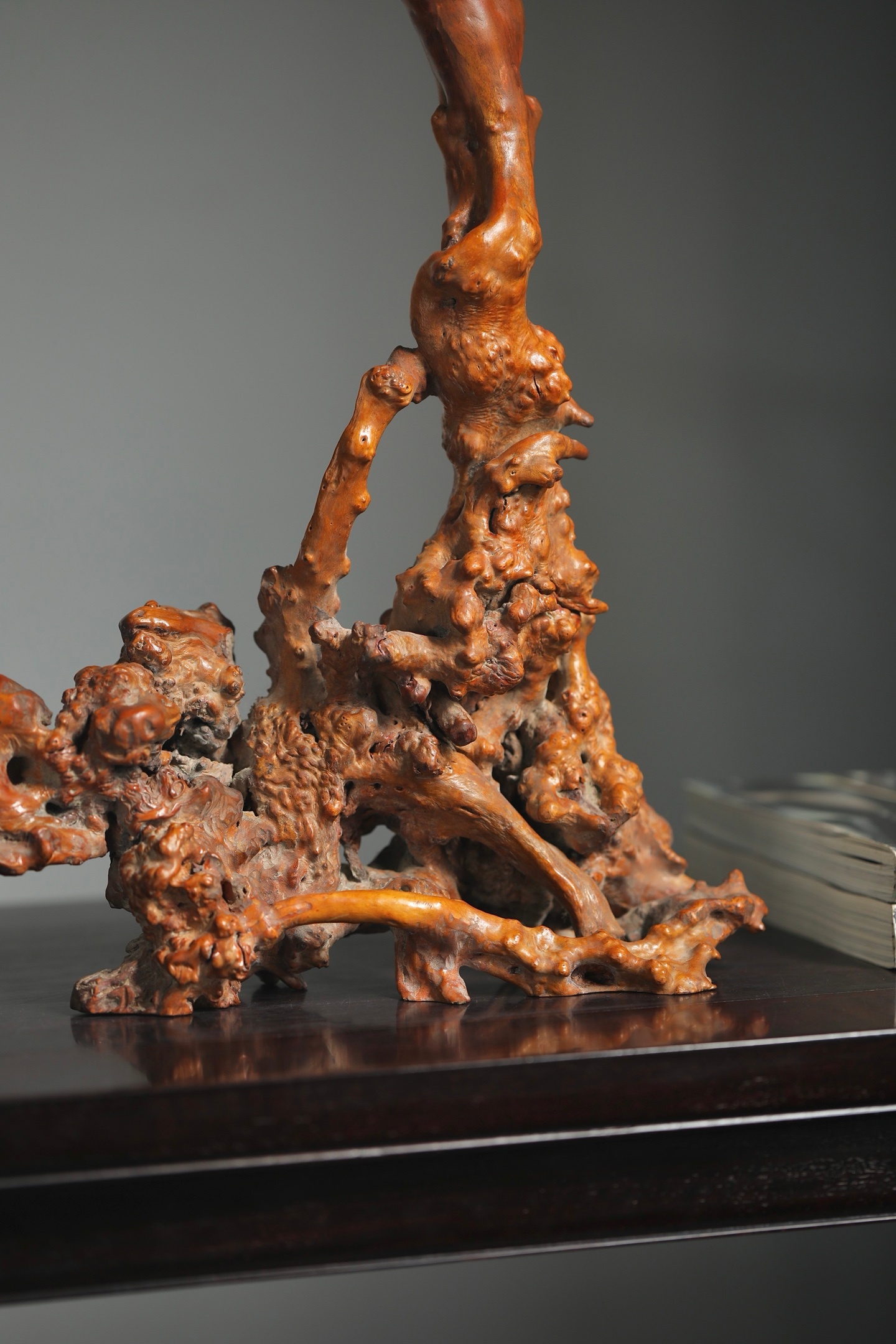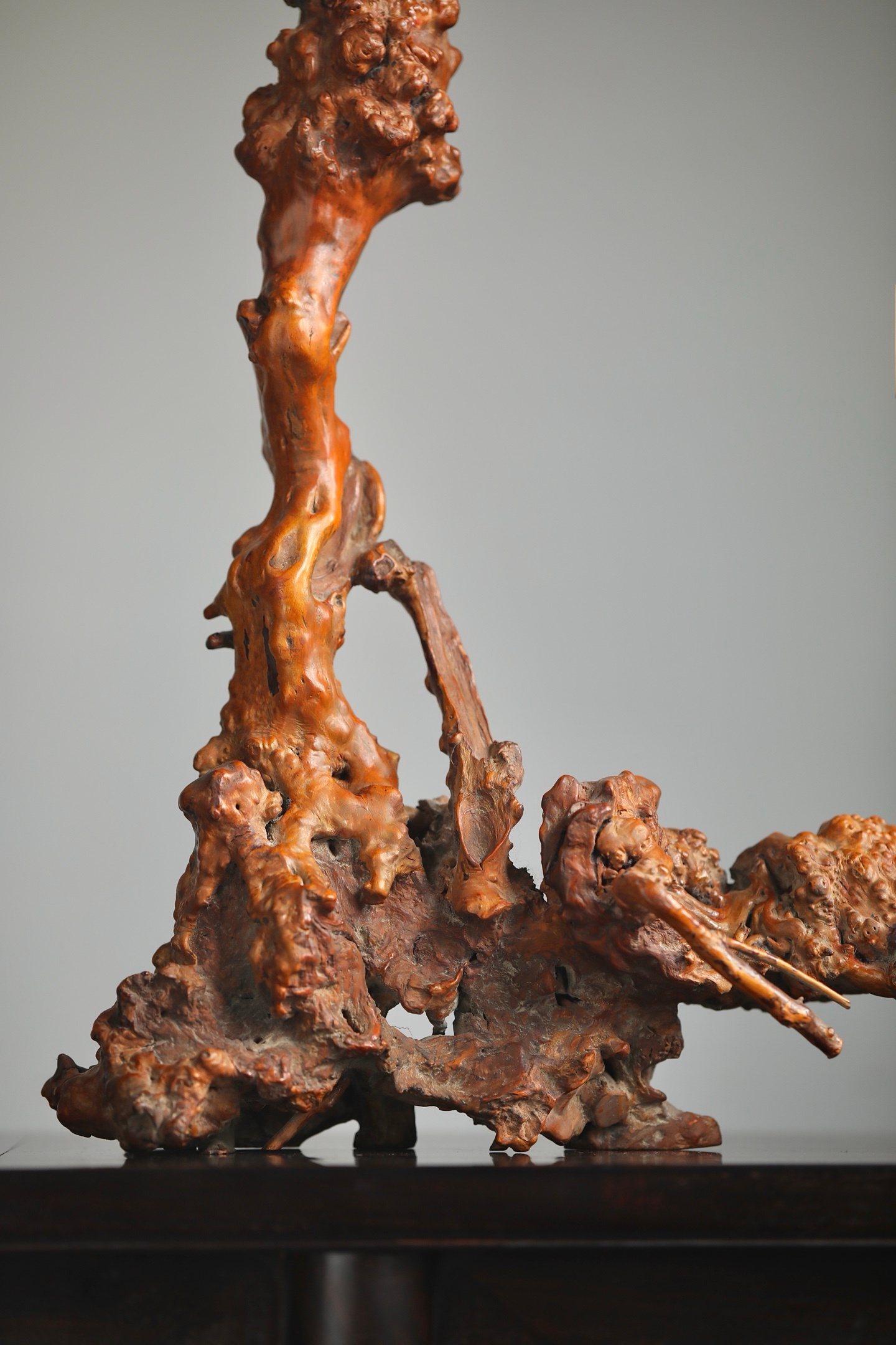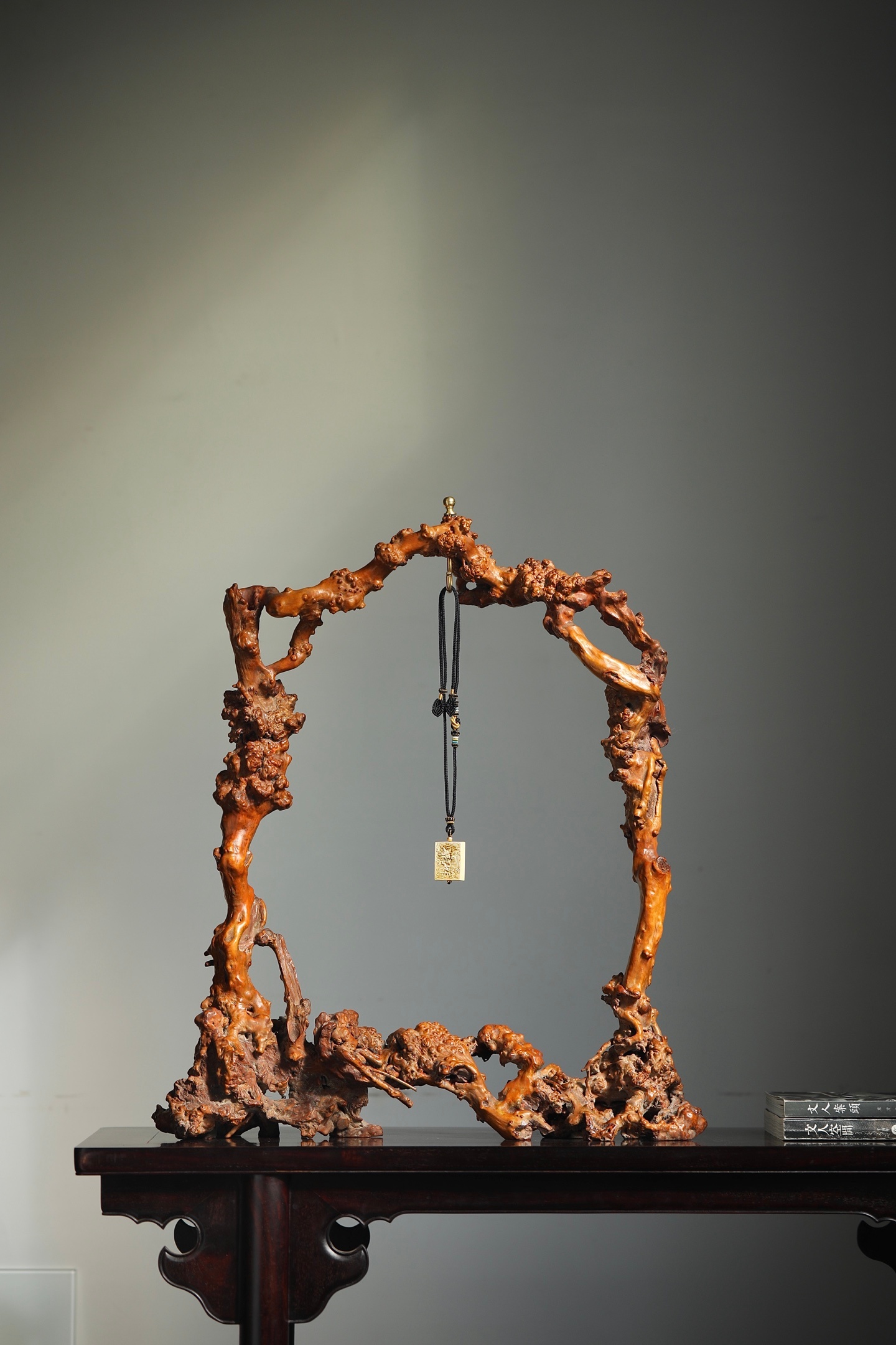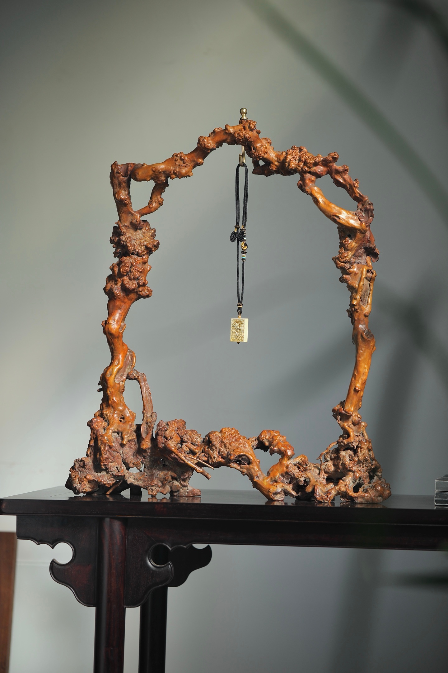 奇木 | 玉挂精选奇木天然瘤疤料制成玉挂架,保留木材原生的虬曲形态与瘤结肌理,每一处纹路都是独一无二的自然馈赠。架身依木形随势打造,无需刻意雕饰,便自带山野嶙峋之美;顶端铜质挂钮精巧实用,垂挂玉牌时,木的温雅与玉的灵秀相映成趣。既是收纳玉饰的实用器,也是中式空间里极具意境的陈设摆件,藏用皆宜。尺寸:55×14×65cm