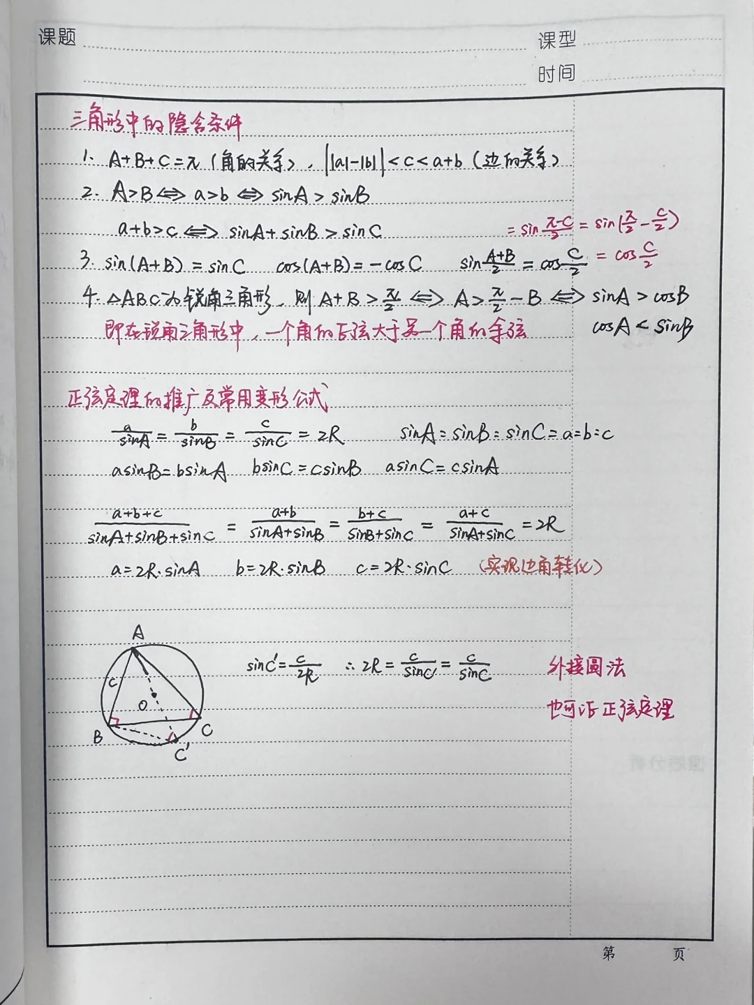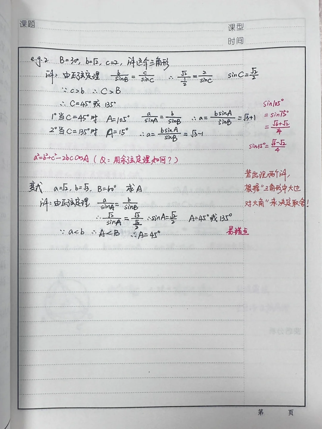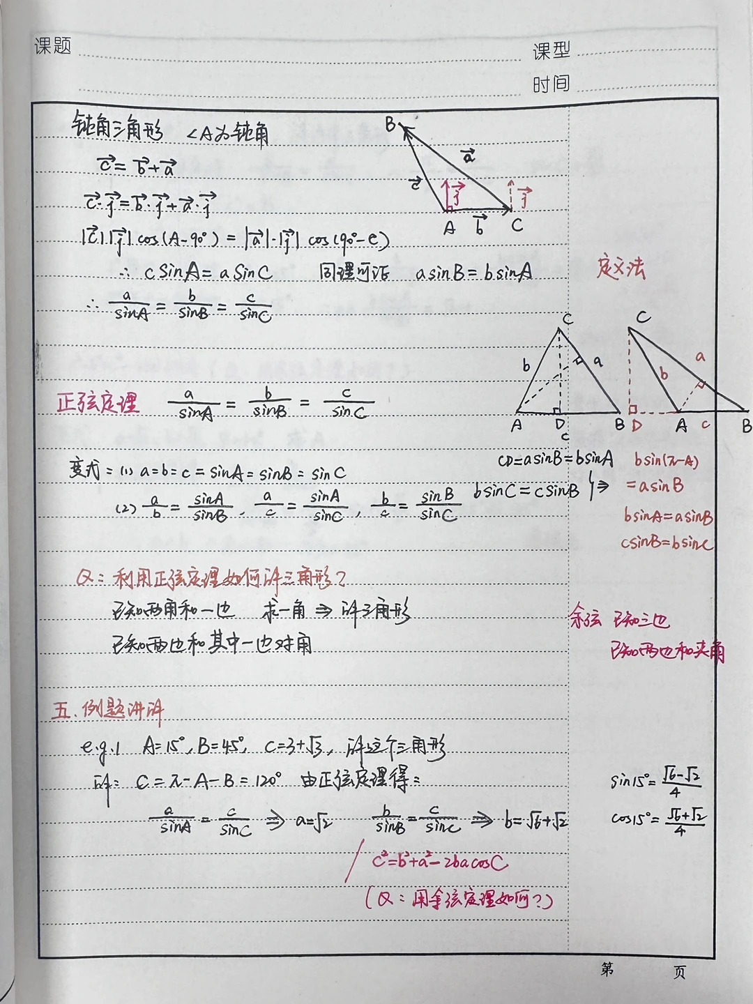 下周才讲正余弦定理,把课先备啦~ 正弦定理是对前期学习的延续和补充。正弦定理既是解三角形内容的补充,也是对初中定性描述三角形边、角关系的结论“大边对大角”的定量解释,同时还为判定三角形全等的条件“ASA”提供理论依据。所以,在教学过程中将密切联系初中的内容及方法,并作适当补充和拓展。