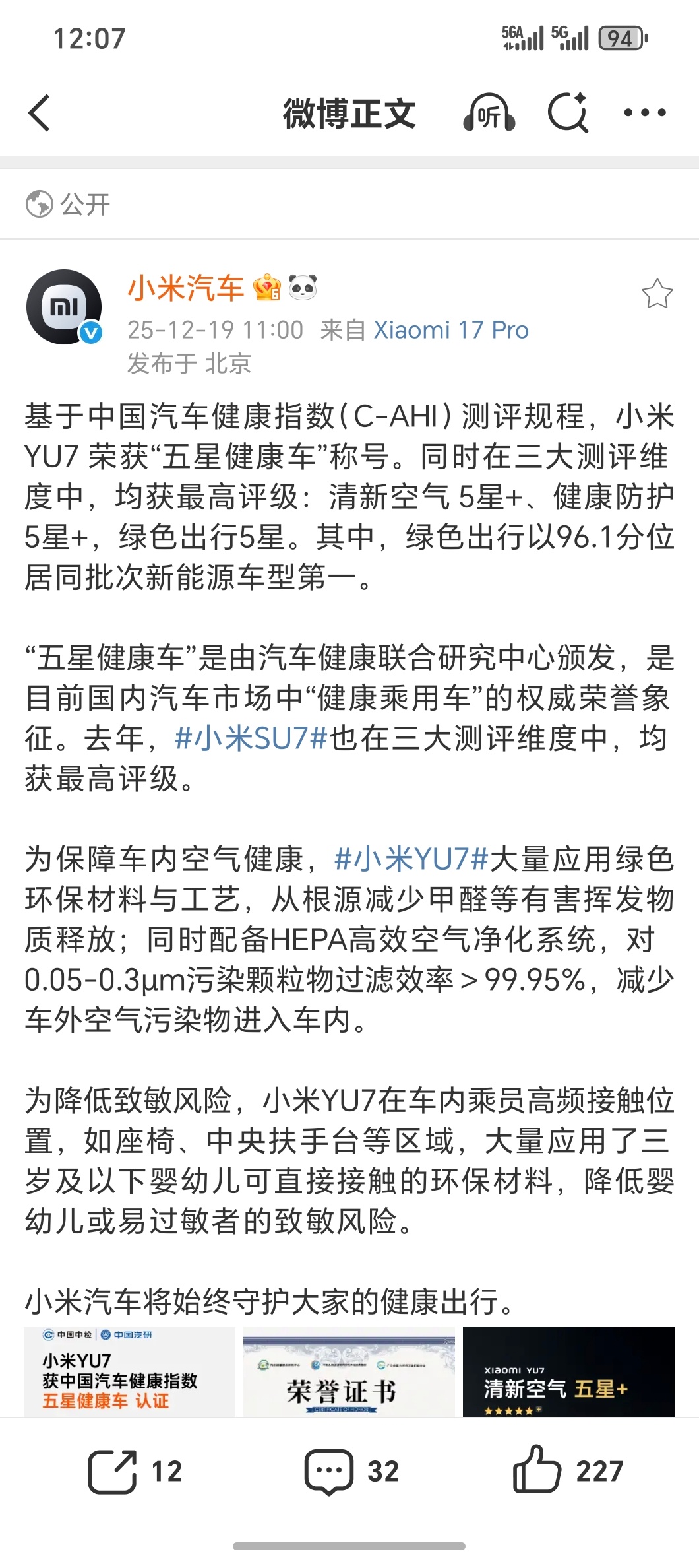 小米YU7拿下C-AHI五星健康车称号!核心测评维度全拿了高评级:座舱相关的“清新空气”“健康防护”都是五星+,同批次第一这一点我刚提车的时候就有感触,全新的车一点异味都没有,内饰大量环保材料,夏天暴晒后甲醛含量也远低于国标,再加上超大HEPA滤芯,雾霾天上车也能放心呼吸,所有的这些都是真金白银 真材实料堆出来的,必须给YU7点个赞