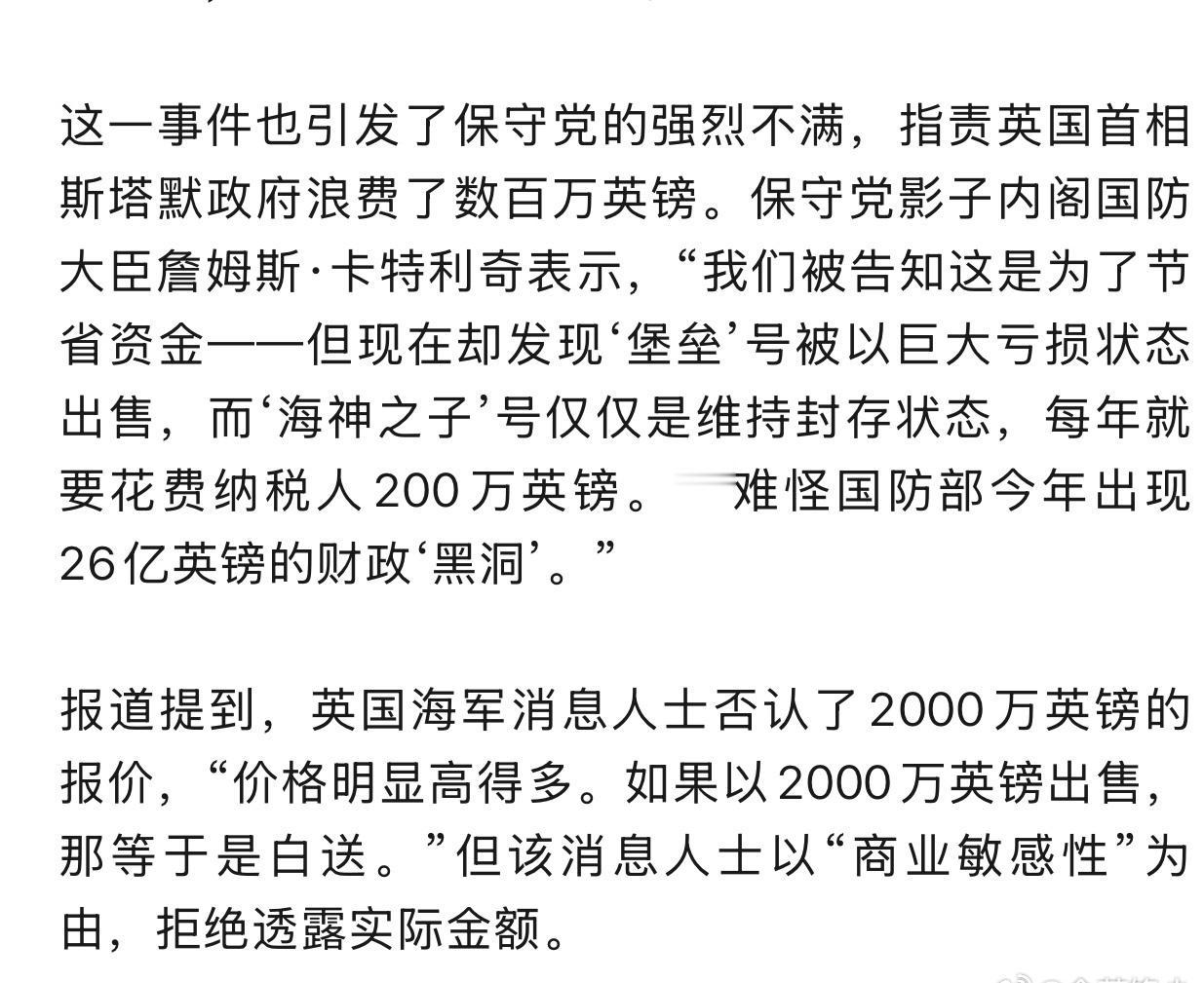 分明是英国人不想出维修费了呢,把它卖掉然后还假装卖得太少了… 7200万英镑翻修英军舰被批卖跳楼价
