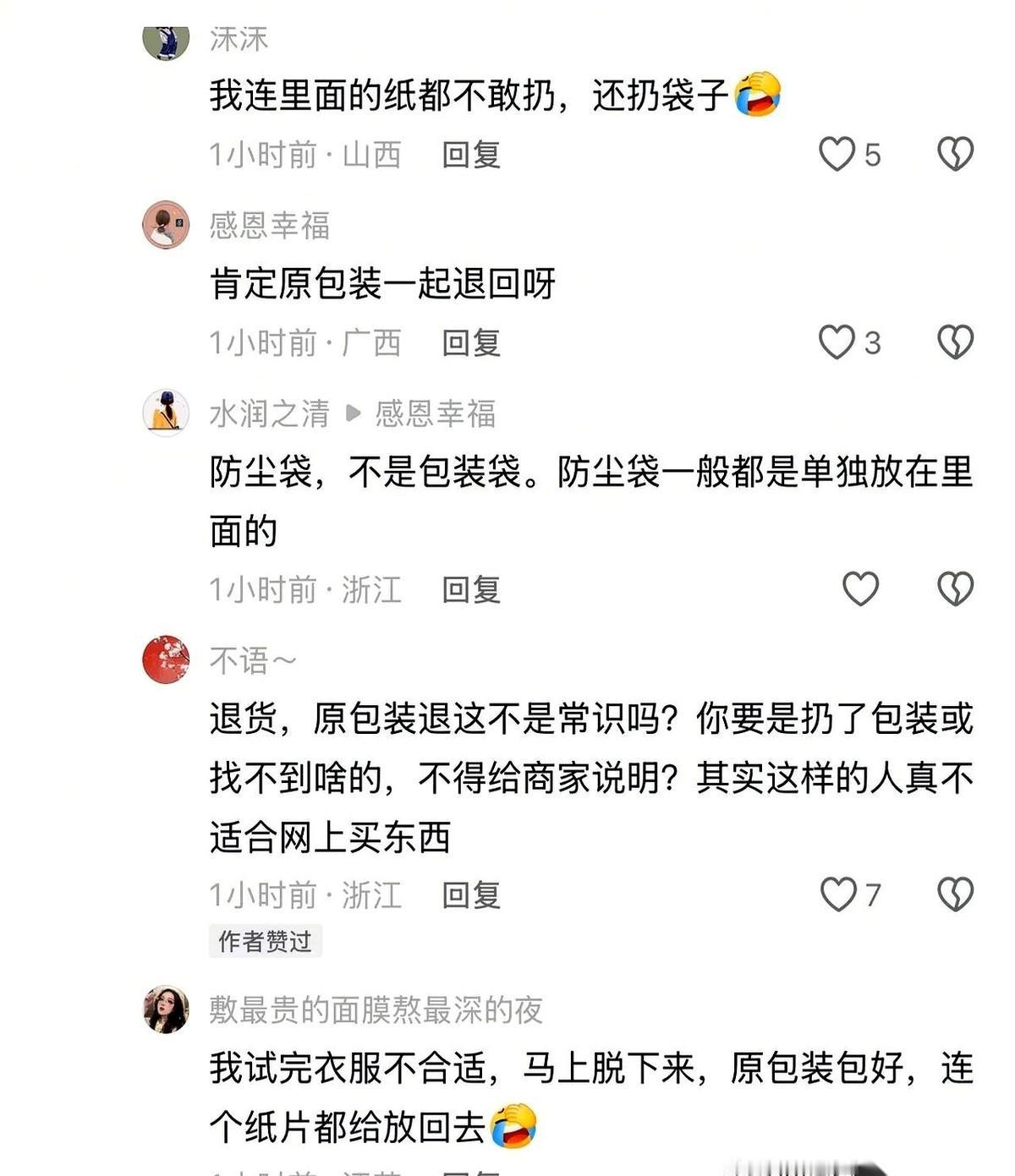 今天看到个事儿,真给我看乐了。 说是在与辉同行买羽绒服,退货的时候,防尘袋没还,被扣了20块。 然后,就觉得天大的委屈,跑到直播间刷屏。 我当时就想,这……这有什么好委屈的? 我退货,别说那个印着logo的防尘袋了,就是里面那张“感谢惠顾”的小卡片,那根绑吊牌的细绳子,我都得给你原封不动地塞回去。 这不是我有多高尚,也不是怕被扣钱。 这是一种……怎么说呢,成年人世界里心照不宣的“体面”吧。 “七天无理由退货”,是平台和商家给你的“后悔权”,是信任。 你试穿了,不喜欢,不合适,OK,咱们一拍两散,把一切恢复原样。你把衣服还我,我把钱还你。 但你不能把这份信任,当成理所当然的便宜去占啊。 把人家的包装袋留下自己用,这算什么?这不叫退货,这叫“薅羊毛”。 20块钱,真不多。 但它就像一面镜子,一下子就把人照得清清楚楚。 说白了,很多小事,真就是“人品测试”。 你以为你在退一件衣服,其实你在退回你的人品。