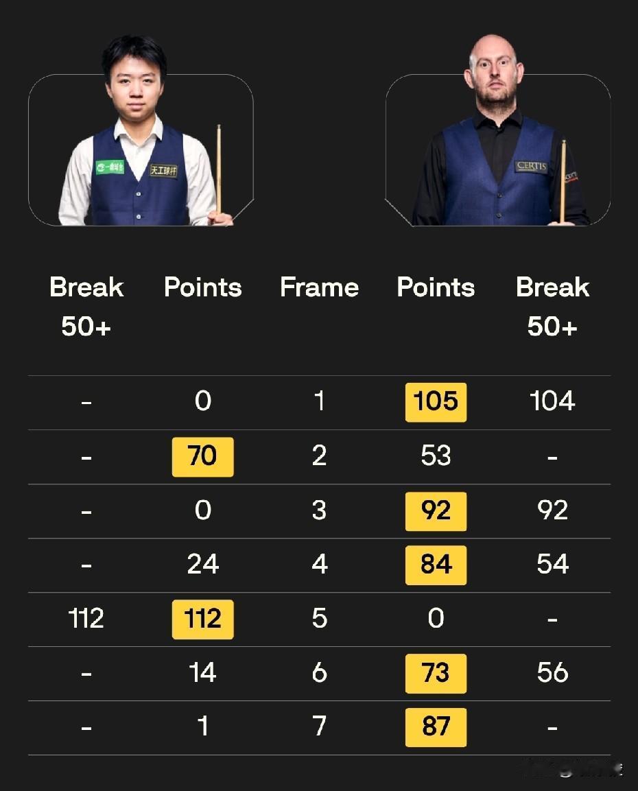 苏格兰公开赛4强出炉,他们是;常冰玉、韦克林、塞尔特、艾伦。半决赛,常冰玉明天凌晨3点迎战艾伦。今天21点,韦克林对塞尔特。 昨晚,周跃龙3-5不敌韦克林,周跃龙一度1-4落后,追回两局,但第8局落败出局。 今天凌晨,江俊2-5负于塞尔特。江俊1-3落后追到2-3,之后连丢两局,2-5被淘汰。江俊准度还可以,但防守和走位需要提升。不过能打进8强,对江俊来说已经完成了任务。 刚刚结束的一场1/4决赛,艾伦5-2战胜奥康纳。第7局,奥康纳40-41落后一分,结果被艾伦做的斯诺克难住,形势极为被动,最终告负。 昨晚第一场比赛,常冰玉5-3击败塞尔比,率先晋级4强。 至此,中国球员在苏格兰公开赛四强中占据一席,到目前为止,这个成绩说得过去,但不算特别理想,接下来就看常冰玉的表现了。 半决赛,常冰玉将迎战艾伦,时间是明天凌晨3点,另一场半决赛将在今天21点进行,由韦克林对塞尔特。 半决赛采用11局6胜。常冰玉 加油!