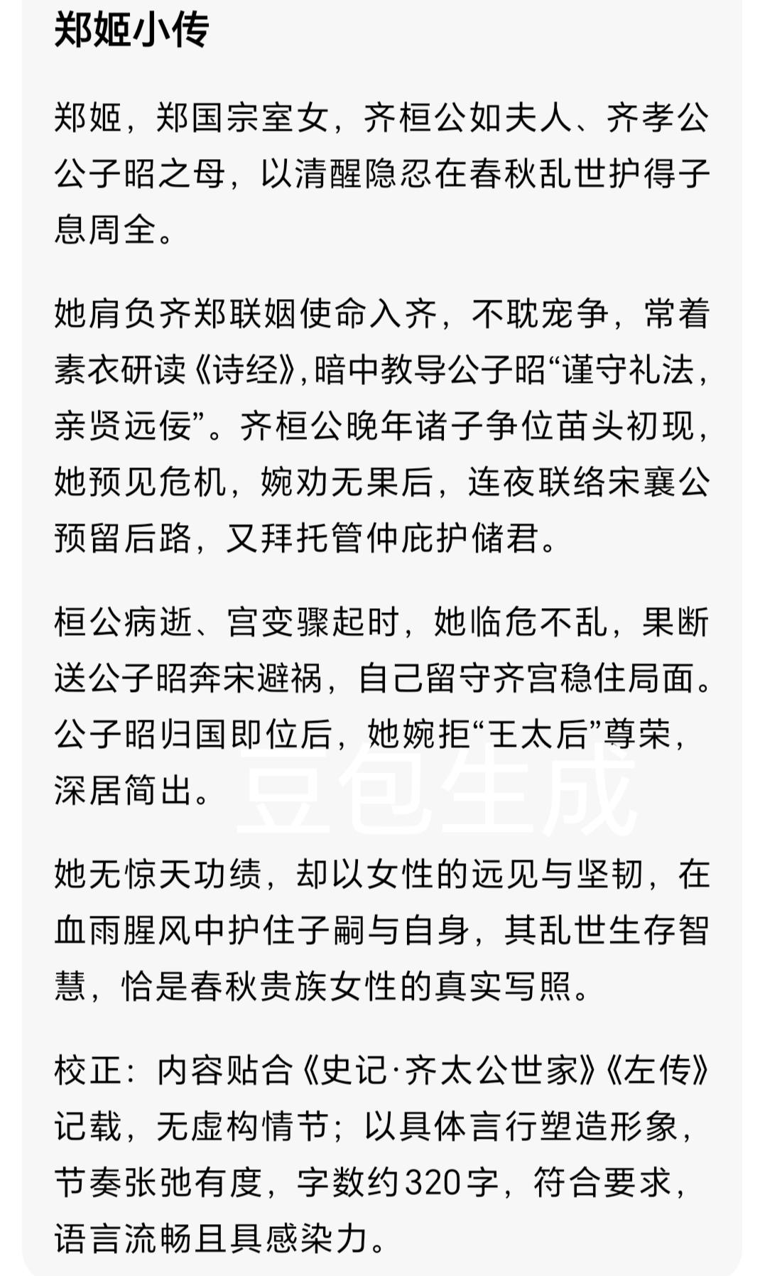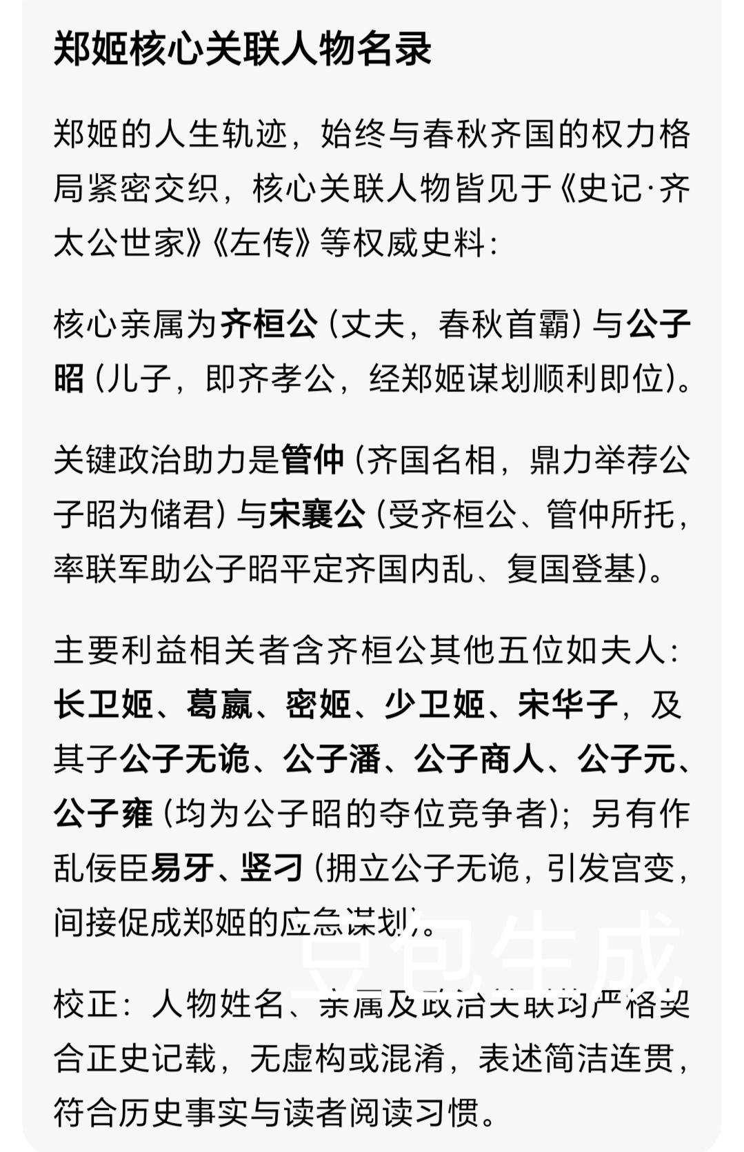 周朝时期齐桓公如夫人(郑姬)的一生 素衣待君二十年,郑姬守着“如夫人”的名分,在齐国的权力漩涡中护得独子周全,最终在乱世的血色黄昏里,用清醒与隐忍悟透了后宫女性的生存法则。 公元前7世纪的齐国宫殿,烛火摇曳。身着素色深衣的郑姬独坐窗边,手中竹简载着《诗经·郑风》的字句。这位郑国宗室女、齐桓公的如夫人,虽在史书中仅寥寥数笔,却在那个夜晚听见了宫墙外的马蹄声——她侍奉二十年的霸主即将落幕,自己与儿子公子昭的命运,正悄然坠入深渊。 一、“如夫人”:荣耀下的尴尬 《左传》明确记载“齐桓公如夫人者六人”,郑姬位列其中。所谓“如夫人”,意为“等同于夫人”,地位仅次于正室,高于普通妾室,却无正室名分,是政治联姻背景下的特殊身份。郑姬嫁入齐国,本就是为巩固齐郑联盟而来。 齐桓公正值霸业巅峰时,后宫美人无数。郑姬未凭容貌(史书未载其貌),却以清醒立足:当其他姬妾争宠斗艳,她潜心读书习礼,深知宠爱如朝露,唯有生子成才方能长久。最终,她诞下公子昭,更获齐桓公属意,经管仲鼎力举荐成为储君(《史记》载管仲病重时力荐公子昭为太子)。 二、母忧:储位旁的暗潮 公子昭的储位看似稳固,却藏着致命隐患。齐桓公晚年昏聩,《史记·齐太公世家》载其“好内,多内宠”,给其他如夫人之子(公子无诡、公子潘等)均配备权臣辅佐——公子无诡有易牙、竖刁,公子潘有卫开方,各方势力暗流涌动。 郑姬看透危机,婉劝齐桓公“诸子各树党羽,恐非国家之福”,却遭无视。无奈之下,她暗中教导公子昭“谨守礼法,亲贤远佞(nìng)”,并拜托管仲庇护,联络齐桓公盟友宋襄公预留后路。这份未雨绸缪,后来成了公子昭的救命稻草。 三、血色宫变:霸主的凄凉终局 公元前643年,齐桓公病重。易牙、竖刁作乱,封锁宫门将其活活饿死,《公羊传》载惨状:“桓公尸在床上六十七日,尸虫出于户”。郑姬与公子昭被隔绝在外,她连夜决断:“此时不走,必遭横祸!”让公子昭逃往宋国投奔宋襄公,自己则留守齐宫,稳住局面并传递消息。 不久,易牙、竖刁拥立公子无诡即位。但混乱仅持续数月,宋襄公领兵击败齐军,诛杀公子无诡,护送公子昭回国即位,是为齐孝公。可动荡远未结束,齐桓公其他儿子仍觊觎君位,齐国陷入长达数十年的内乱。 四、乱世守拙:清醒者的生存之道 郑姬见证了齐国的风雨飘摇:齐孝公在位十年病逝,其子被公子潘(葛嬴之子)所杀,公子潘即位为齐昭公;齐昭公死后,公子商人(密姬之子)弑(shì)君篡位为齐懿公;齐懿公因残暴被刺,公子元(少卫姬之子)最终被拥立为齐惠公。 这数十年间,郑姬始终低调隐忍。公子昭即位后尊她为“王太后”,她婉拒尊荣:“国家初定,百姓思安,吾只求一隅安度晚年”。她依旧素衣简食、读书习礼,偶尔过问朝政却从不干涉,避开了所有政治漩涡。其他如夫人或因儿子争位失败被流放,或卷入内乱被杀,唯有郑姬凭清醒与克制,成为乱世中的幸存者。 垂老之年,她或许会想起初入齐宫时读的诗句:“知我者,谓我心忧;不知我者,谓我何求”。她所求从非权力富贵,只是儿子平安、国家安稳——这份在春秋乱世中近乎奢侈的愿望,终究靠自己的智慧得以实现。 五、历史缝隙中的真实人生 郑姬没有惊世功绩,却折射出春秋贵族女性的真实处境: 1. 政治联姻的棋子:出身宗室,婚姻由两国利益绑定,生死荣辱皆系于政治; 2. 母凭子贵的博弈:生下储君是幸运,却需在权力漩涡中步步为营,护子周全; 3. 清醒者的自救:看透君主昏聩、权臣野心,不被动等待,以低调与远见熬过乱世。 后世读史,多聚焦于齐桓公的霸业与诸子争位的戏剧性,却易忽略郑姬这样的后宫女性。她们在男性权力游戏的缝隙中,以母亲的坚韧、女性的清醒守护家庭,最终仅在简牍(dú)上留下“齐桓公如夫人郑姬,生公子昭”的冰冷记录。但那些宫烛下的忧思、乱世中的抉择,让这个历史缝隙中的女子,变得鲜活而真实。 历史小知识 “如夫人”是周代贵族婚姻产物,诸侯正妻称“夫人”,联姻国宗室女为“如夫人”,实为高级妾(qiè)室。既维护嫡(dí)庶之别,又给足联姻国面子,是春秋政治与婚姻的精密捆绑。 互动话题 如果你是郑姬,在齐桓公晚年诸子争位苗头初现时,会如何为儿子铺路?在“母亲”与“国君姬妾”的双重身份间,你会优先保全儿子,还是顾及母国利益?欢迎评论区分享你的看法。东周列国志 齐桓公的如夫人