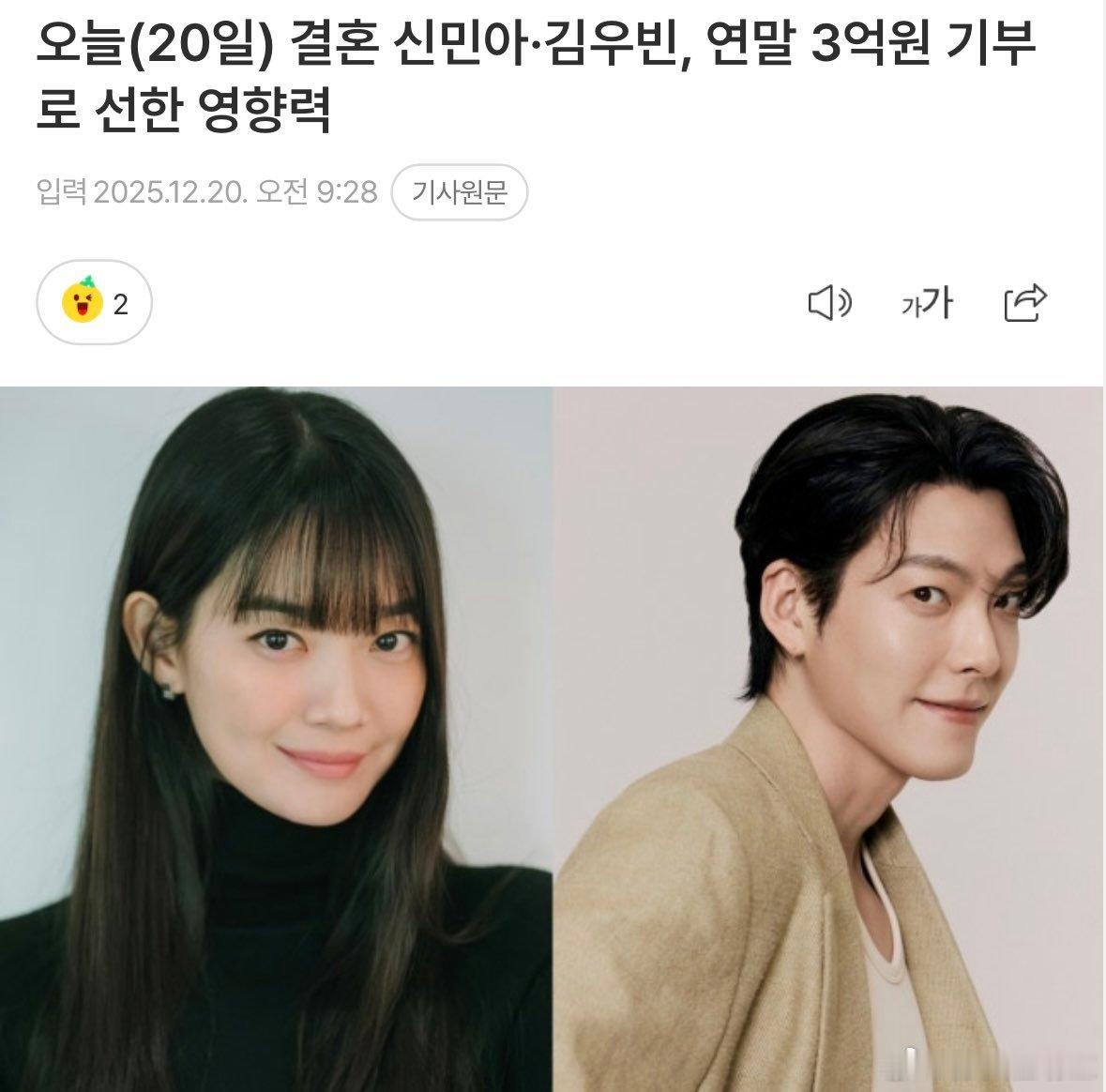 天呐真是人美心善夫妇👩❤️👨今天结婚的申敏儿和金宇彬在年底捐赠3亿韩元,以产生积极影响。一直热衷于慈善活动的申敏儿和金宇彬,在今年年底向翰林烧伤基金会、首尔峨山医疗中心和好朋友等多个组织捐赠了总计3亿韩元,表达了他们的爱心。